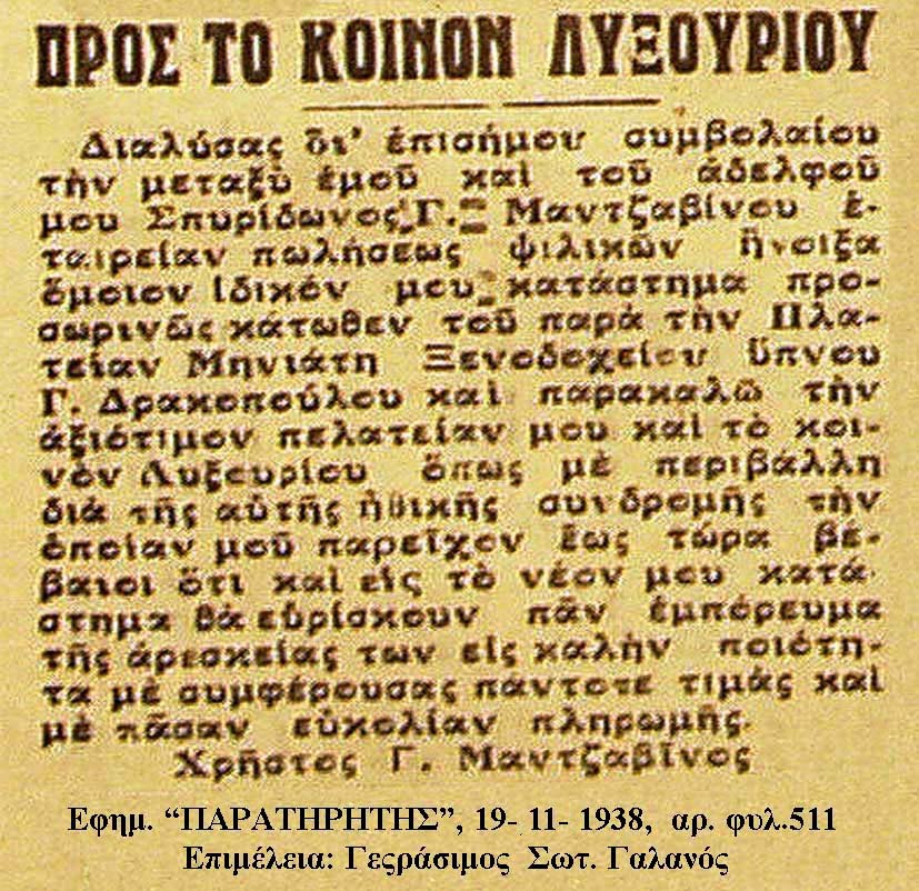 Προσεισμικά, ο Χρήστος ο Καρνάουλας, είχε κατάστημα ψιλικών μαζί με τον αδελφό του Σπυρίδωνα Μαντζαβίνο, και το 1938, αποφάσισαν να λύσουν το συμβόλαιο της «Εταιρείας Πωλήσεων Ψιλικών» και να κάνει ο καθένας το δικό του κατάστημα.