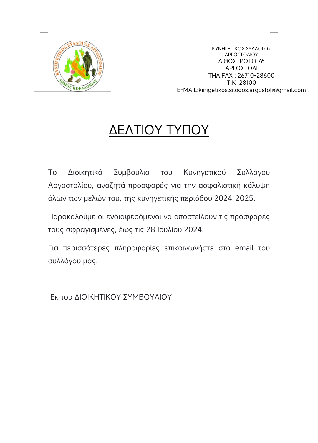Ο Κυνηγετικός Σύλλογος Αργοστολίου αναζητά προσφορές για ασφαλιστικές καλύψεις μελών
