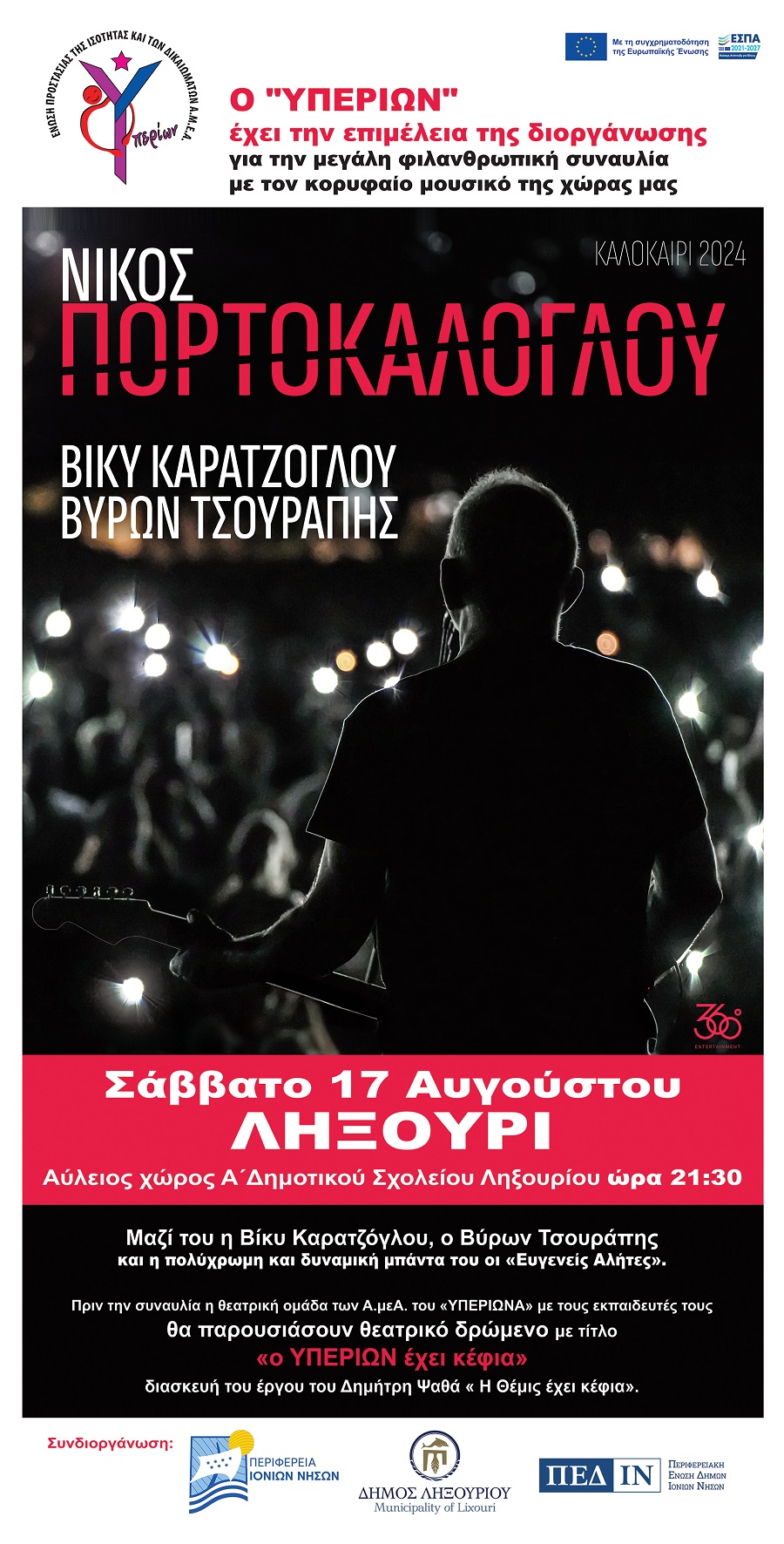 Μην ξεχάσετε την Αυγουστιάτικη καλοκαιρινή εκδήλωση του ΥΠΕΡΙΩΝΑ αύριο Σάββατο 17 Αυγούστου και ώρα 21:30 μ.μ στον Αύλειο χώρο του Α΄ Δημοτικού σχολείου Ληξουρίου με μικρό θεατρικό δρώμενο από τους ωφελούμενους Α.μεΑ. του ΥΠΕΡΙΩΝΑ και το κορυφαίο μουσικό γεγονός του καλοκαιριού, η μεγάλη συναυλία με τον Νίκο Πορτοκάλογλου, την Βίκυ Καρατζόγλου, τον Βύρωνα Τσουράπη και τους ευγενείς αλήτες.