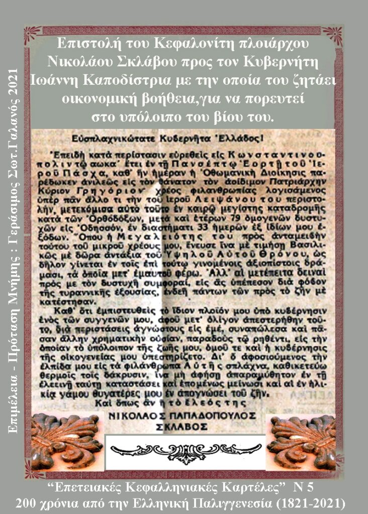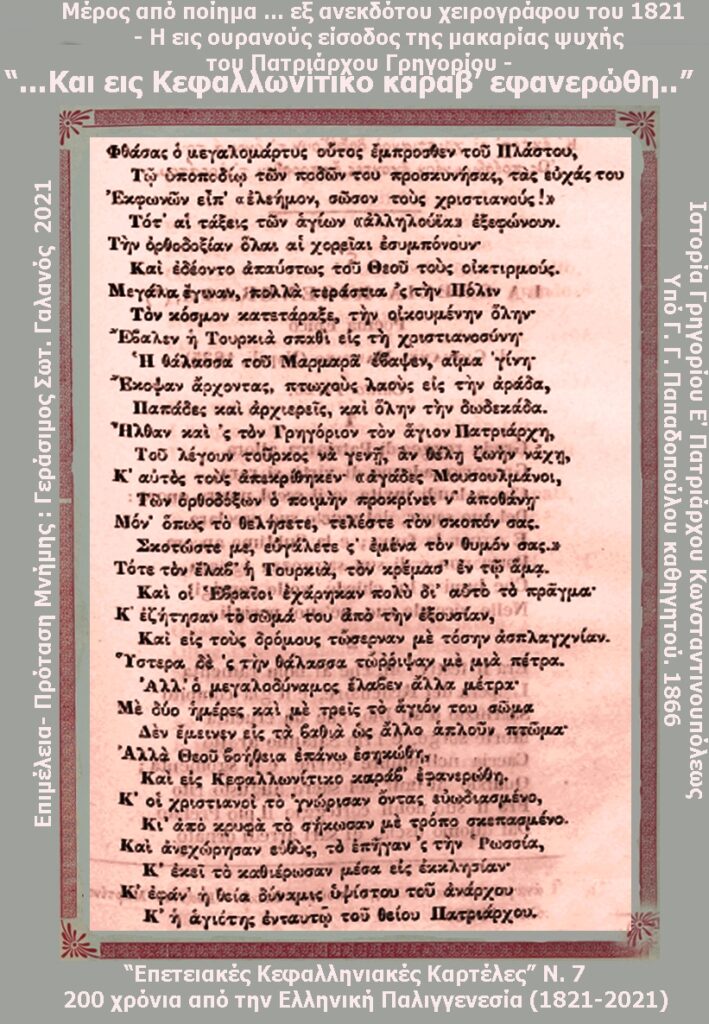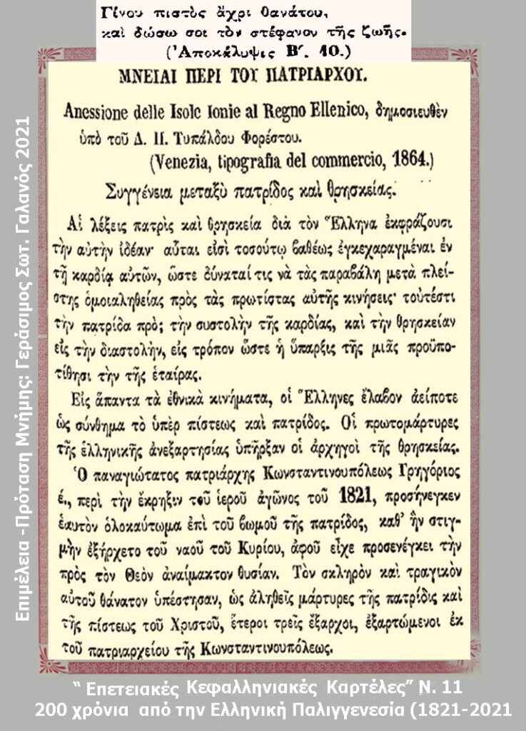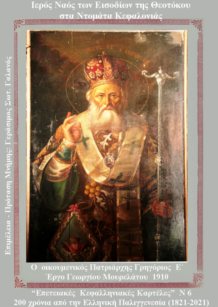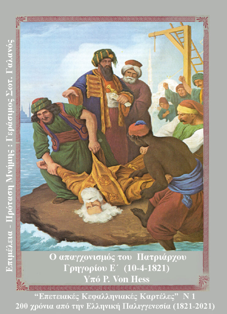 Γράφοντας για ιστορικές πτυχές του 1821 σε σχέση με την Κεφαλονιά, συνεχίζω με το τέταρτο κείμενο, το οποίο είναι αφιερωμένο στη μνήμη του Πατριάρχου Γρηγορίου του Ε΄.