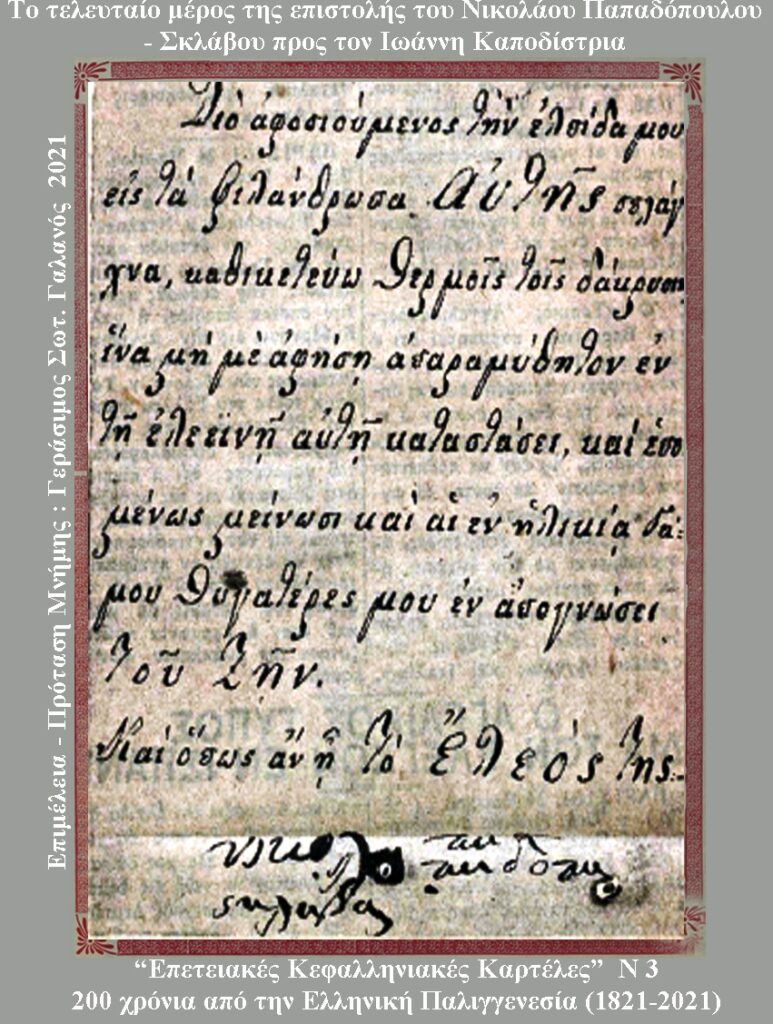 Κλείνοντας τη σύντομη αναφορά του πατριάρχη Γρηγορίου του Ε΄ και η σχέση του γενικά με τους Ιόνιους, διανθίζω τη δημοσίευσή μου τούτη με «Καρτέλες Εορταστικές», ώστε να λειτουργούν «ως συνοπτικά ιστορικά εικάσματα», λόγω που ο νέος διαδικτυακός τρόπος ενημέρωσης και προβολής εξυπηρετείται καλύτερα.