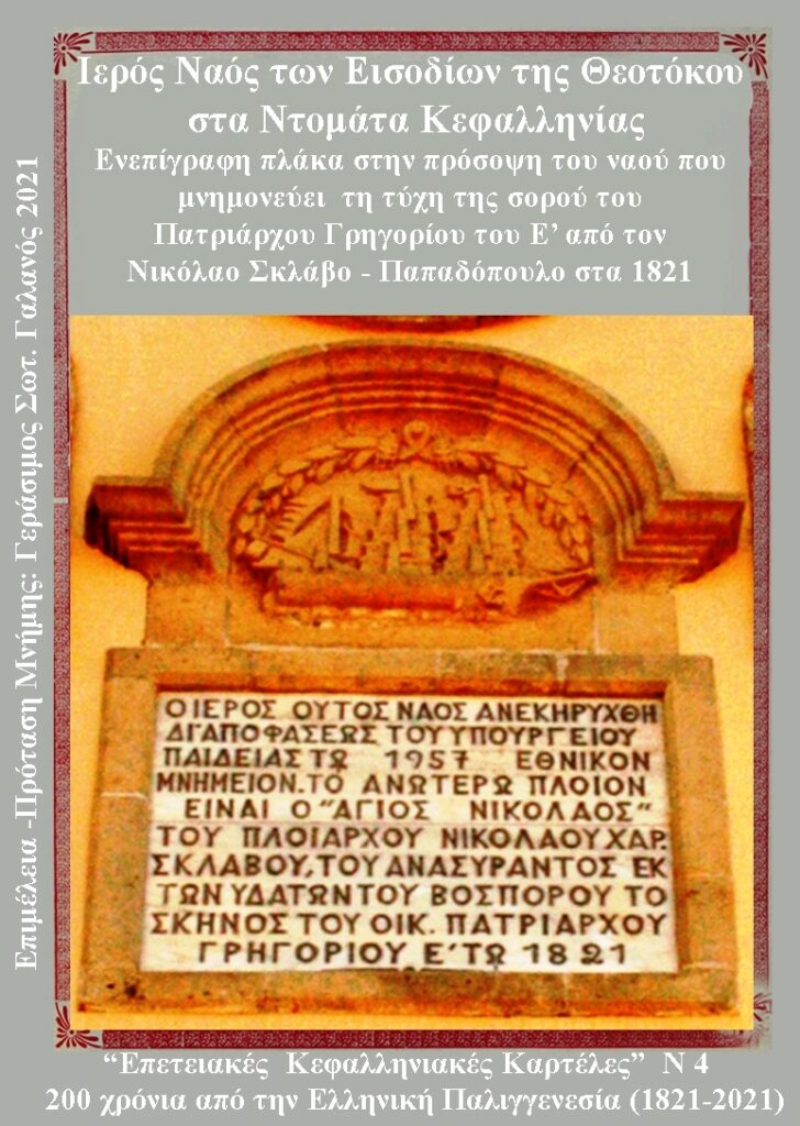 Η διάσωση της σορού του πατριάρχη Γρηγορίου του Ε΄ από τον Κεφαλονίτη θαλασσομάχο καραβοκύρη Μαρή – Νικόλαο Σκλάβο- Παπαδόπουλο, είναι ιστορική και δεν τεκμηριώνεται μόνο από τα κειμήλια που μας άφησε στο ναό της Παναγίας στα Ντομάτα, αλλά και από επίσημες ιστορικές αναφορές, που την εποχή εκείνη μνημονεύτηκαν από τους παρατηρητές ιστορικούς των γεγονότων του 1821.