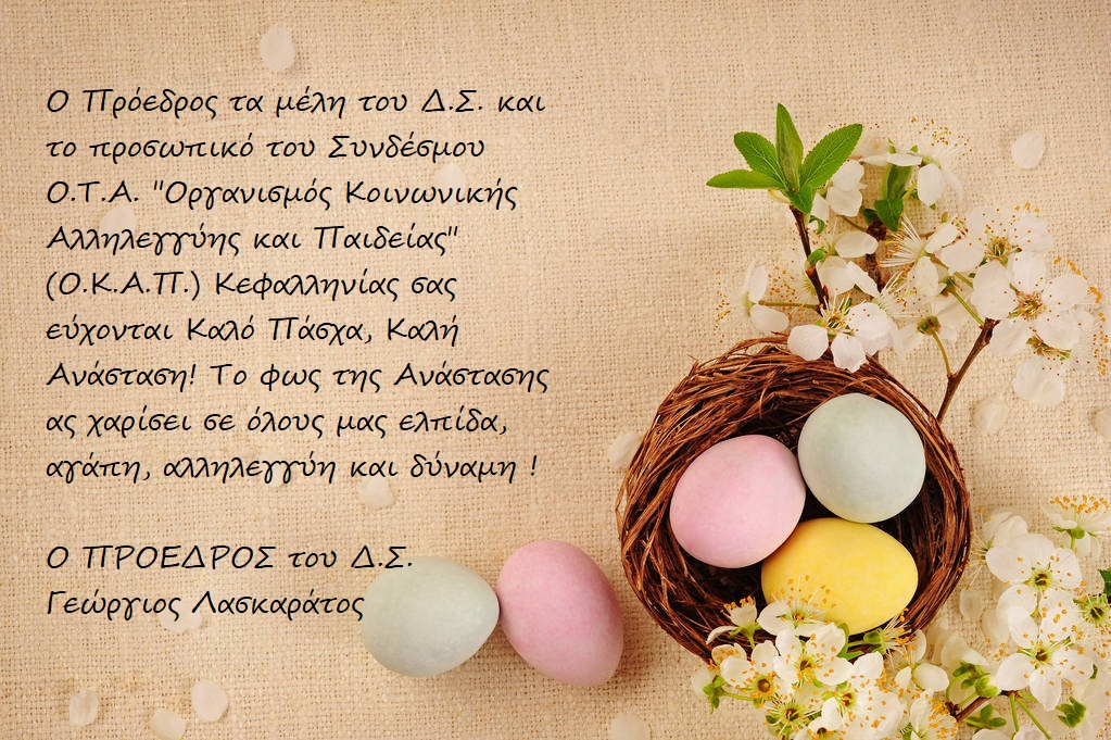 Ο Πρόεδρος, τα μέλη του Δ.Σ. και το προσωπικό του Συνδέσμου Ο.Τ.Α. “Οργανισμός Κοινωνικής Αλληλεγγύης και Παιδείας” (Ο.Κ.Α.Π.) Κεφαλληνίας σας εύχονται Καλό Πάσχα, Καλή Ανάσταση! Το φως της Ανάστασης ας χαρίσει σε όλους μας ελπίδα, αγάπη, αλληλεγγύη και δύναμη !