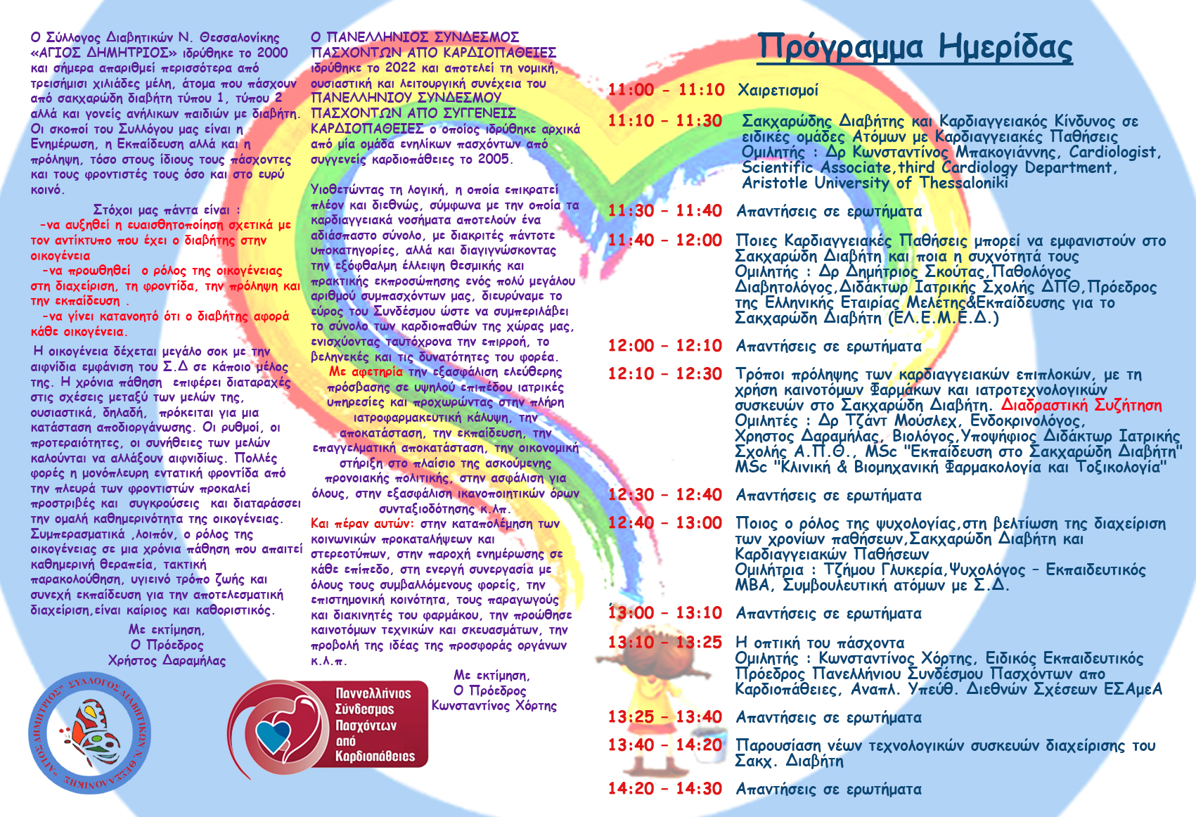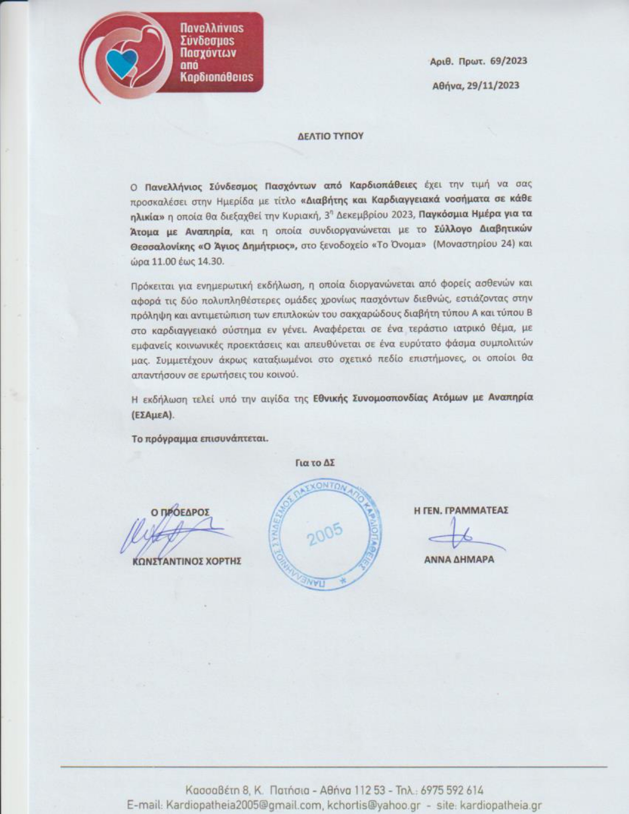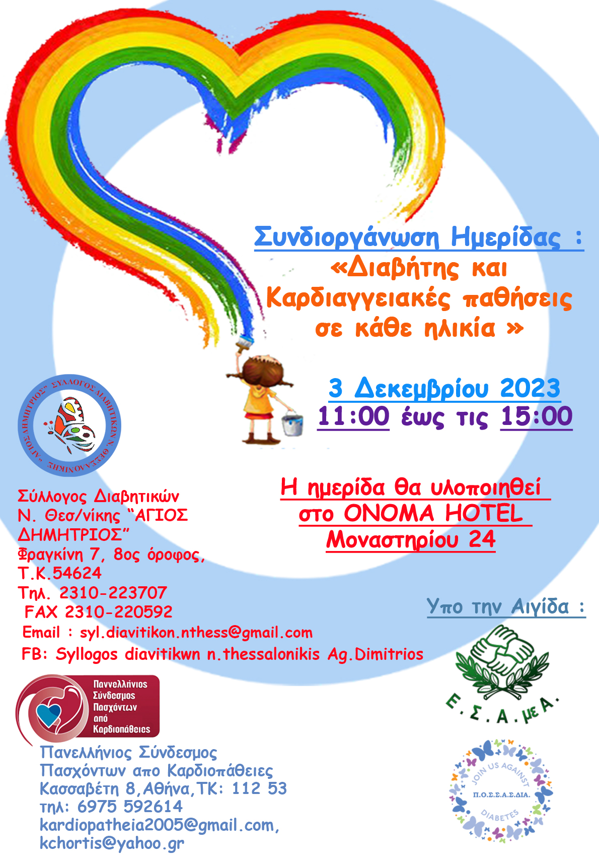 Ο Πανελλήνιος Σύνδεσμος Πασχόντων από καρδιοπάθειες διοργανώνει ημερίδα με θέμα “Διαβήτης και καρδιαγγειακά νοσήματα σε κάθε ηλικία” στην Αθήνα την Κυριακή 3 Δεκεμβρίου