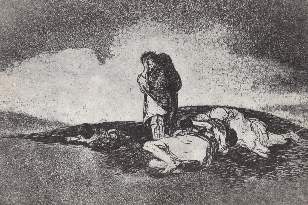 Το 1808 ο βασιλιάς της Ισπανίας παραιτήθηκε και τον διαδέχτηκε ο γιος του, Φερδινάνδος Ζ’, ο οποίος κατέφυγε στο εξωτερικό λόγω της εισβολής των στρατευμάτων του Ναπολέοντα.  Ανάμεσα στα διασημότερα έργα του Γκόγια, αυτής της περιόδου, ανήκει ένας κύκλος χαρακτικών με γενικό τίτλο «Οι Συμφορές του Πολέμου», με 80 χαρακτικά. O Γκόγια κατέγραφε με απελπισμένη ένταση τους αγώνες, τα μαρτύρια, τις ψευδαισθήσεις και τις ήττες ενός λαού, που πίστευε και είχε την ελπίδα πως η Ελευθερία και η Αλήθεια θα άλλαζαν την πορεία της Ιστορίας. Με οξύτητα και ρεαλιστικό βλέμμα  απεικόνισε την μετατροπή ανθρώπων σε τέρατα. Οι ιστορικοί της τέχνης θεωρούν τη σειρά ως μια εικαστική διαμαρτυρία κατά της βίας της και της οπισθοχώρησης του φιλελευθερισμού μετά την παλινόρθωση της μοναρχίας των Βουρβόνων.  Τα χαρακτικά δεν δημοσιεύτηκαν μέχρι το 1863, 35 χρόνια μετά τον θάνατό του. Πιθανώς μόνο τότε θεωρήθηκε πολιτικά ασφαλές να δημοσιευθεί μία σειρά τέτοιων επικριτικών έργων. Με την απαράμιλλη σχεδιαστική του ικανότητα, ο Γκόγια κατάφερε να αποτυπώσει και να σχολιάσει καυστικά σ’ αυτές τις εκπληκτικές χαλκογραφίες τα έκτροπα της κοινωνίας που έβλεπε γύρω του και να καταγγείλει με δριμύτητα τα δεινά και τον παραλογισμό του πολέμου.