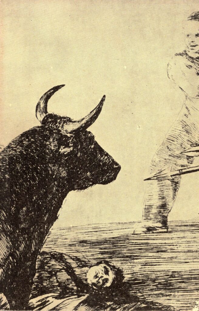 Το 1819 ο Γκόγια μετακόμισε στα περίχωρα της Μαδρίτης και το εξοχικό του ονομάστηκε «Το σπίτι του κουφού». Εκεί αρρώστησε βαριά, την ίδια περίοδο που φιλοτέχνησε τους αποκαλούμενους «Μαύρους πίνακές» του. Το 1824 εγκαταστάθηκε αρχικά στο Παρίσι, ενώ αργότερα έζησε στο Μπορντό μέχρι το τέλος της ζωής του το 1828. Στα τελευταία χρόνια  του ολοκλήρωσε την περίφημη ενότητα «Ταυρομαχίες», με 33 χαρακτικά. Στην ύστερη ενότητα «Τρέλες», με 18 χαρακτικά, οι αλλόκοτες φαντασιώσεις του Γκόγια φθάνουν στο αποκορύφωμα. Ο Αντρέ Μαλρώ αναφέρει: «Για πρώτη φορά ένας καλλιτέχνης άκουσε να αναβλύζει μέσα του ένα μήνυμα από το διαρκές τραγούδι του σκότους». Το έργο του Φρανσίσκο Γκόγια, σύμφωνα με τον παλιό διευθυντή της Εθνικής Πινακοθήκης Μαρίνο Καλλιγά, «ξεκινά από τον ρεαλιστικό, πρόσχαρο και φωτεινό παλιόκοσμο και καταλήγει στο τέλος της ζωής του σε εξπρεσιονιστικές μορφές και στο χείλος της αβύσσου που αντιμετωπίζει με δέος η… γυμνή ύπαρξη του ανθρώπου».