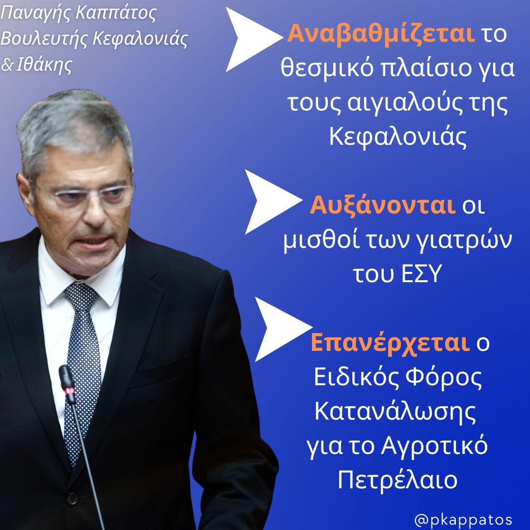 Παναγής Καππάτος Αναβαθμίζεται το θεσμικό πλαίσιο για τους αιγιαλούς της Κεφαλονιάς, αυξάνονται οι μισθοί των γιατρών του ΕΣΥ, επανέρχεται ο Ειδικός Φόρος Κατανάλωσης για το Αγροτικό Πετρέλαιο