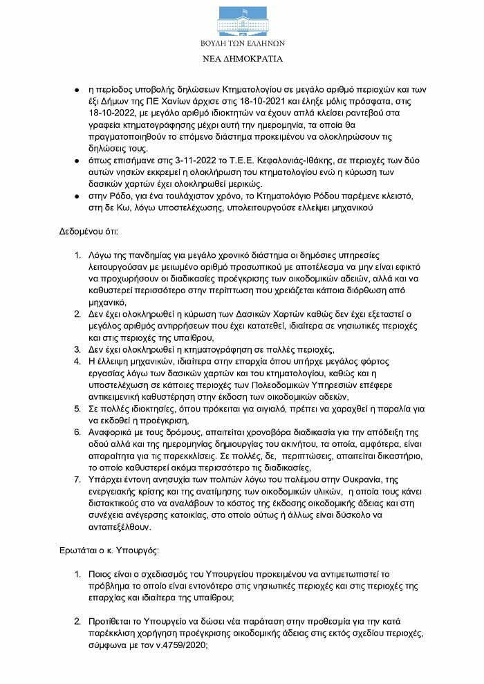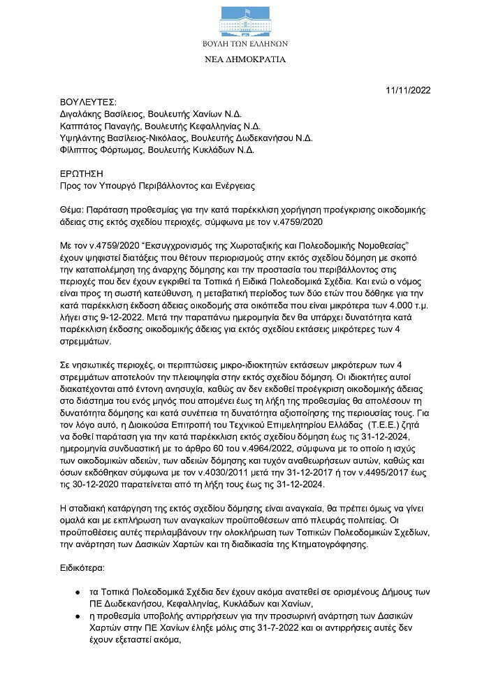 Ερώτηση και Αναφορά προς τον Υπουργό Περιβάλλοντος κ. Σκρέκα για την κατά παρέκκλιση χορήγηση οικοδομικής άδειας στις εκτός σχεδίου περιοχές