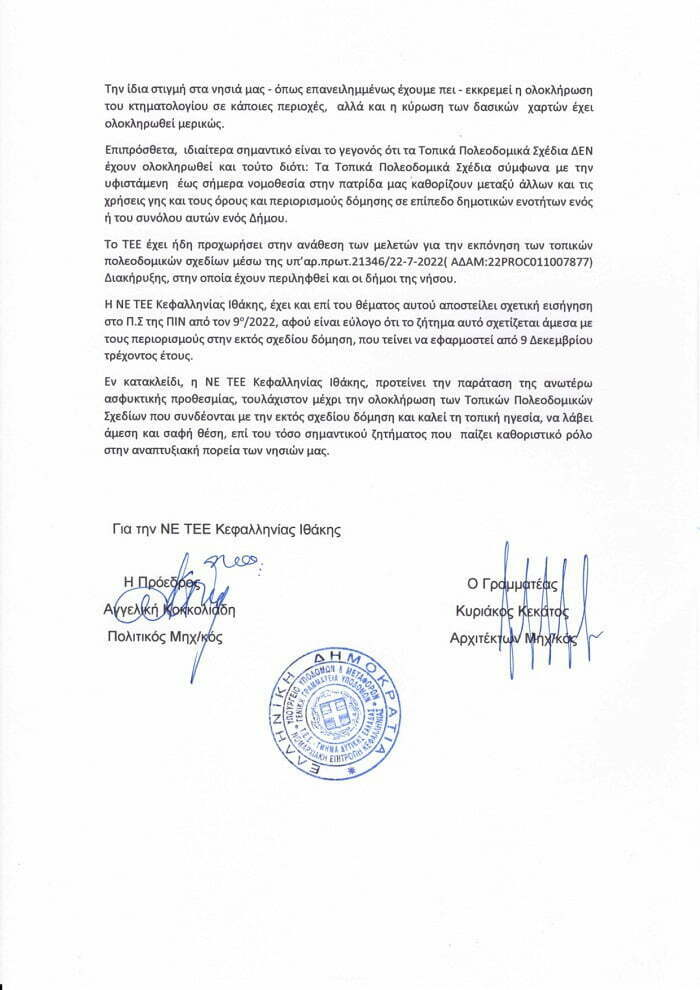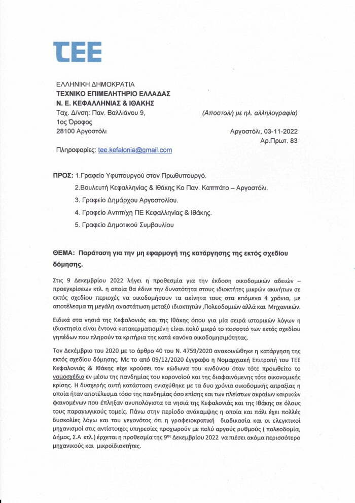 Επιπλέον, στα πλαίσια του Κοινοβουλευτικού Ελέγχου, με Αναφορά μου στο Υπουργείο Περιβάλλοντος και Ενέργειας κατέθεσα επιστολή του Τεχνικού Επιμελητηρίου Ελλάδας (Νομαρχιακή Επιτροπή Κεφαλονιάς-Ιθάκης), στην οποία παρατίθενται οι λόγοι για τους οποίους οι επαγγελματίες του κατασκευαστικού κλάδου προτείνουν την παράταση της προθεσμίας.