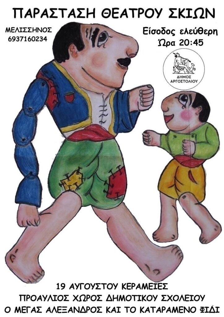 Στις ΚΕΡΑΜΕΙΕΣ, στον Προαύλιο χώρο του Γυμνασίου-Λυκείου, στις 20.45 θα πραγματοποιηθεί η παράσταση του Καραγκιόζη που είχε αναβληθεί λόγω της δύσκολης κατάστασης που επικρατούσε εξαιτίας των πυρκαγιών στην περιοχή της Λειβαθούς και ο Δήμος Αργοστολίου προσκαλεί τους μικρούς αλλά και τους μεγάλους φίλους του Καραγκιόζη, να διασκεδάσουν με την παράσταση Θεάτρου Σκιών «Ο ΚΑΡΑΓΚΙΟΖΗΣ Ο ΜΕΓΑΣ ΑΛΕΞΑΝΔΡΟΣ & ΤΟ ΚΑΤΑΡΑΜΕΝΟ ΦΙΔΙ» από τον Αλέξανδρο Μελισσηνό.