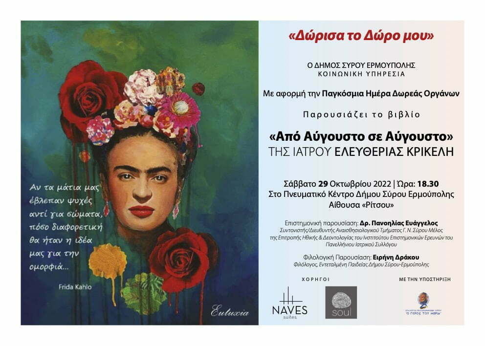 Ο Δήμος Σύρου Ερμούπολης με αφορμή την Παγκόσμια ημέρα Δωρεάς Οργάνων παρουσιάζει το Σάββατο 29 Οκτωμβρίου και ωρα 18.30 στο Πνευματικό Κέντρο Δήμου Σύρου Ερμούπολης Αίθουσα Ρίτσος το βιβλίο της Βραβευθήσας για το έργο της στην Δωρεάν Οργάνων Ιατρού-Συγγραφέα κ Ελευθερίας Κρικέλη //Από Αύγουστο σε Αύγουστο//.