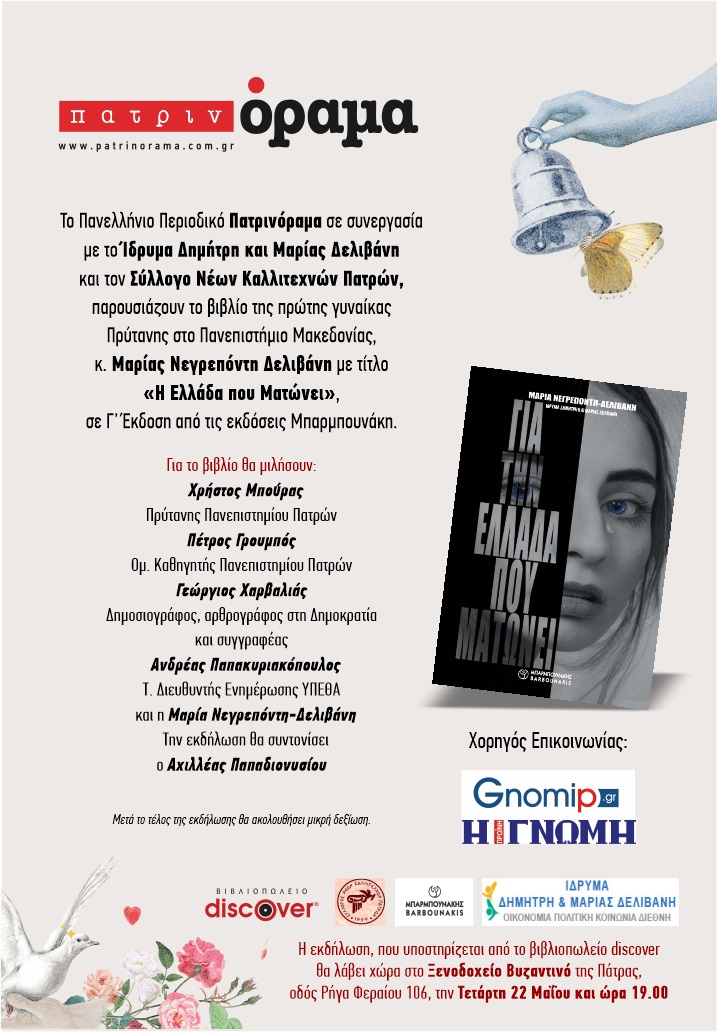 Το Πανελλήνιο Περιοδικό Πατρινόραμα σε συνεργασία με το Ίδρυμα Δημήτρη και Μαρίας Δελιβάνη και τον Σύλλογο Νέων Καλλιτεχνών Πατρών παρουσιάζουν το βιβλίο της πρώτης γυναίκας Πρύτανης στο Πανεπιστήμιο Μακεδονίας κ Μαρίας Νεγρεπόντη Δελιβάνη με τίτλο «Η Ελλάδα που Ματώνει», από τις εκδόσεις Μπαρμπουνάκη.