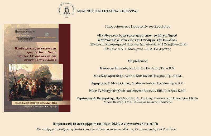 Παρουσίαση των Πρακτικών του Συνεδρίου «Πληθυσμιακές μετακινήσεις προς τα Ιόνια Νησιά από τον 13ο αιώνα έως την Ένωση με την Ελλάδα»