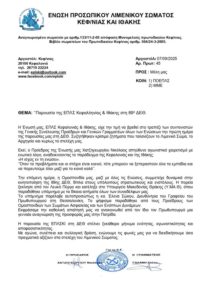 Παρουσία της ΕΠΛΣ Κεφαλονιάς & Ιθάκης στη 89η ΔΕΘ