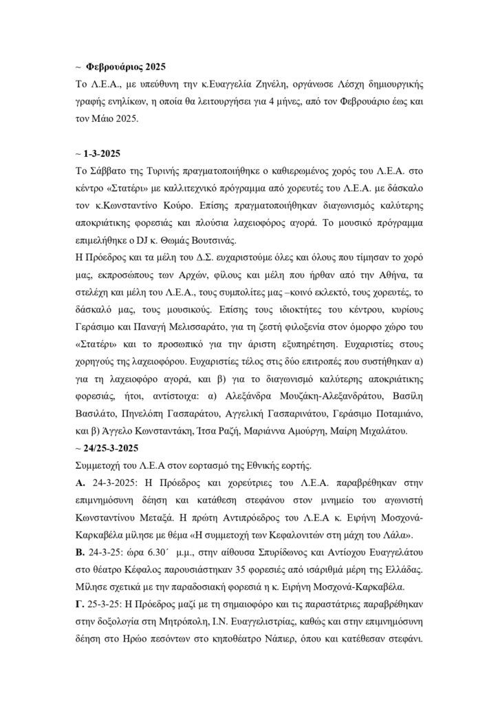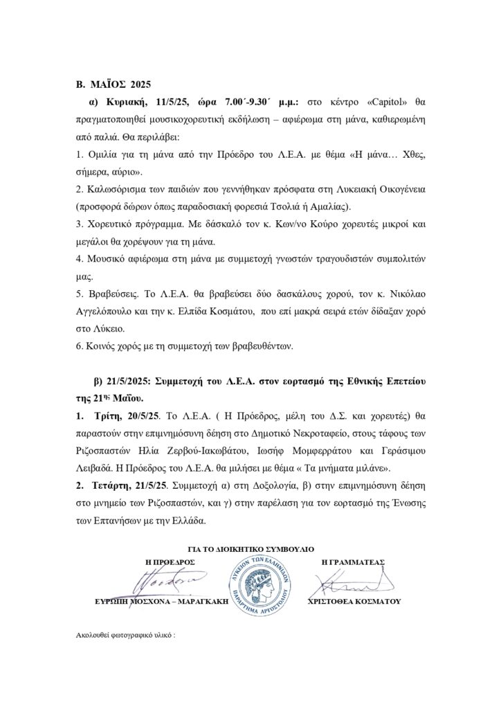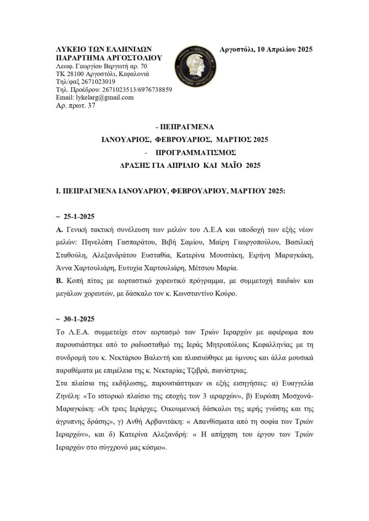 Πεπραγμένα του Λυκείου Ελληνίδων και πρόγραμμα δράσεων για Απρίλιο και Μάιο