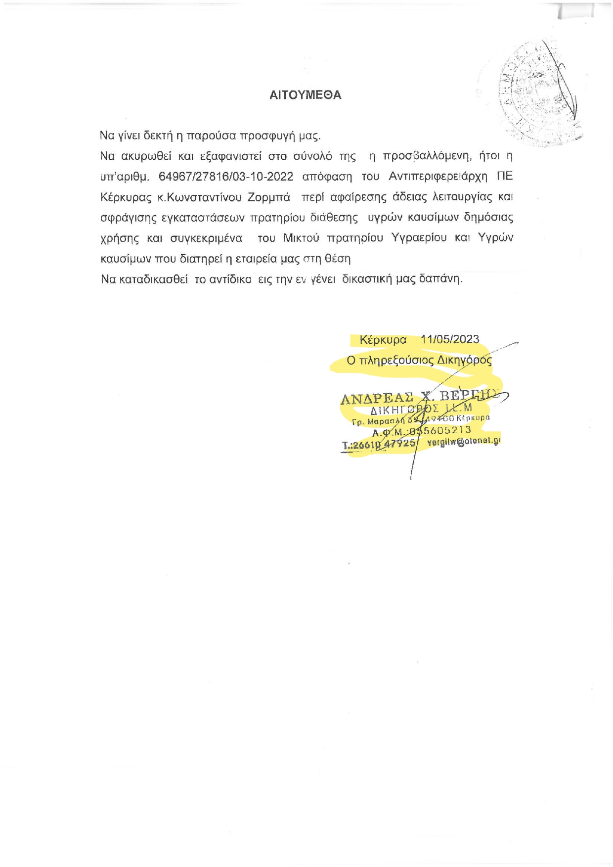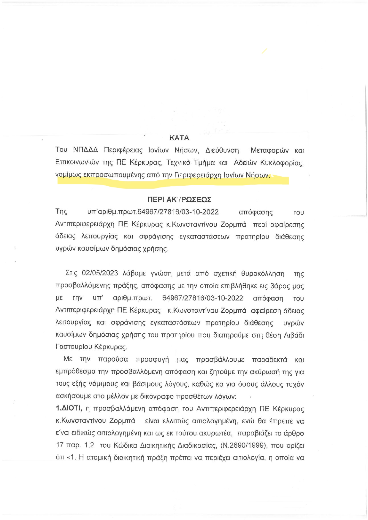 Όπως προκύπτει από τα έγγραφα που έχουμε στην διάθεση μας, η περιφέρεια αφαίρεσε την άδεια λειτουργίας ενός πρατηρίου καυσίμων και αερίου στην Κέρκυρα. Ω του θαύματος την υπεράσπιση του ιδιώτη αναλαμβάνει ο σύμβουλος της περιφερειάρχη.