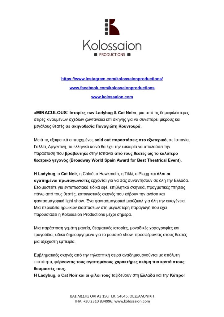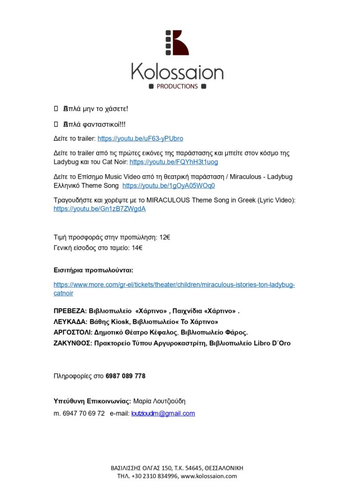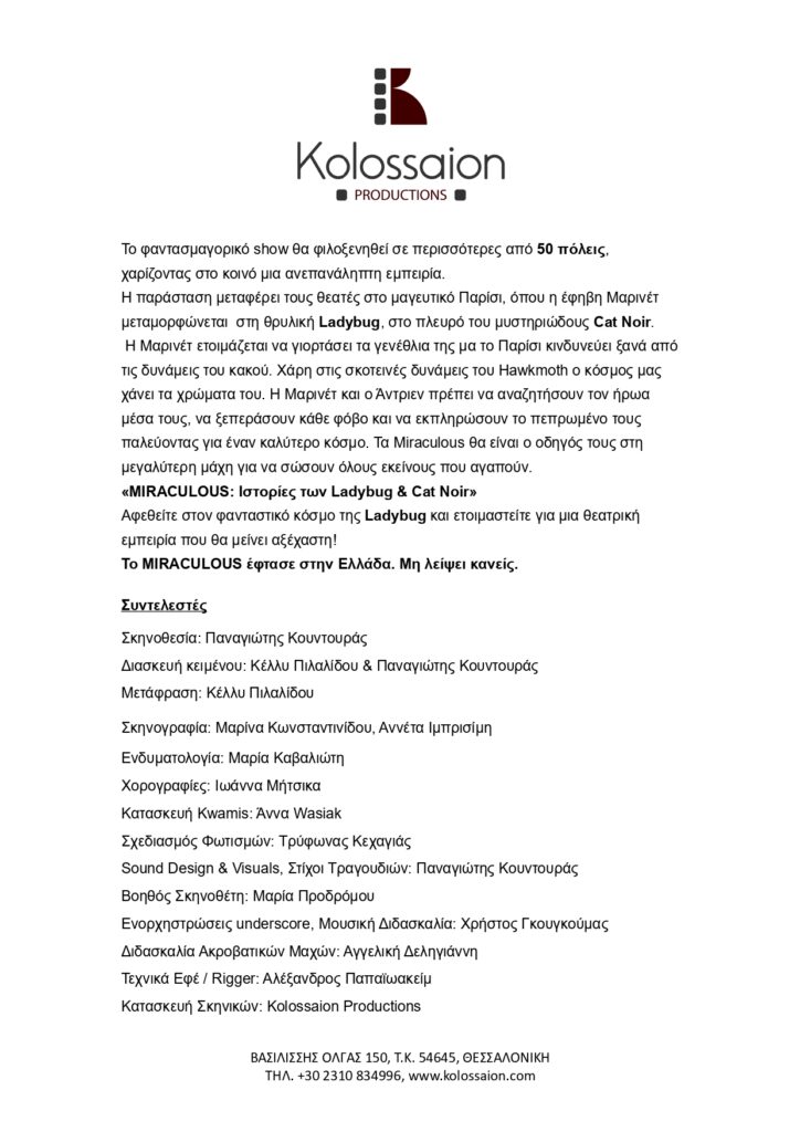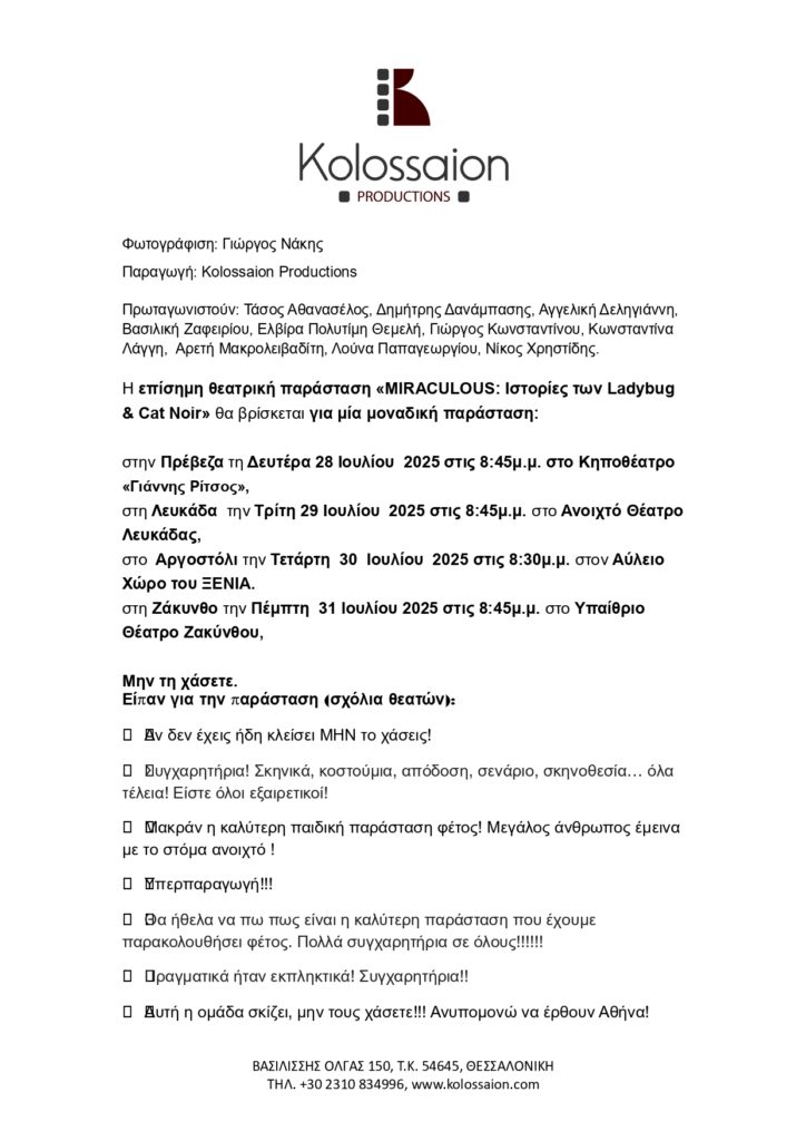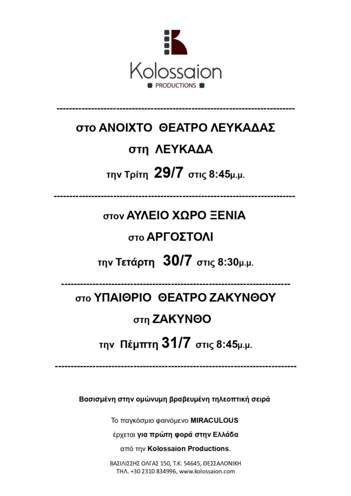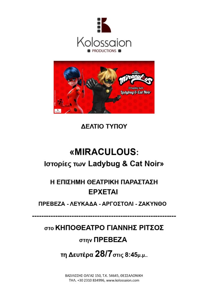 ΠΡΕΒΕΖΑ ΛΕΥΚΑΔΑ ΑΡΓΟΣΤΟΛΙ ΖΑΚΥΝΘΟΣ Miraculous Ιστορίες των Ladybug και Cat Noir θεατρική παράσταση 28, 29, 30, 31, Ιουλίου 2025