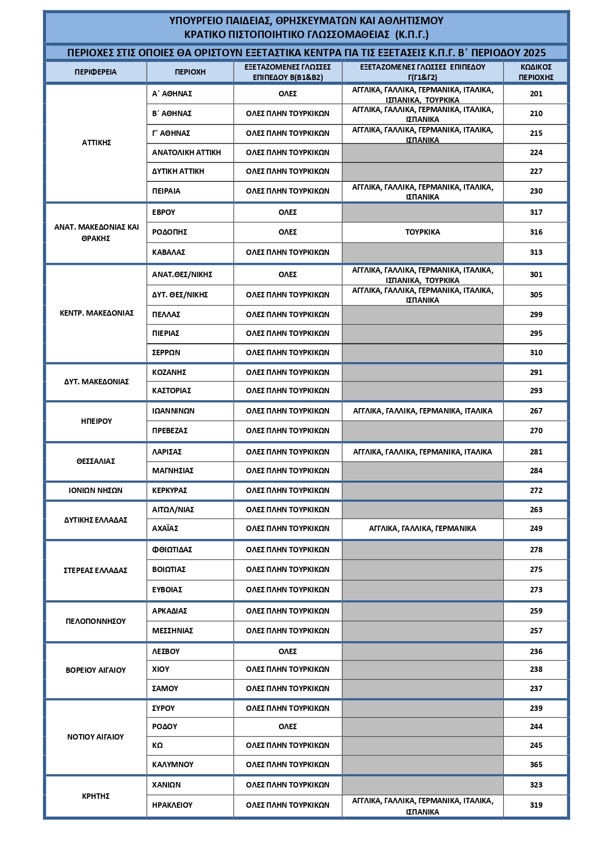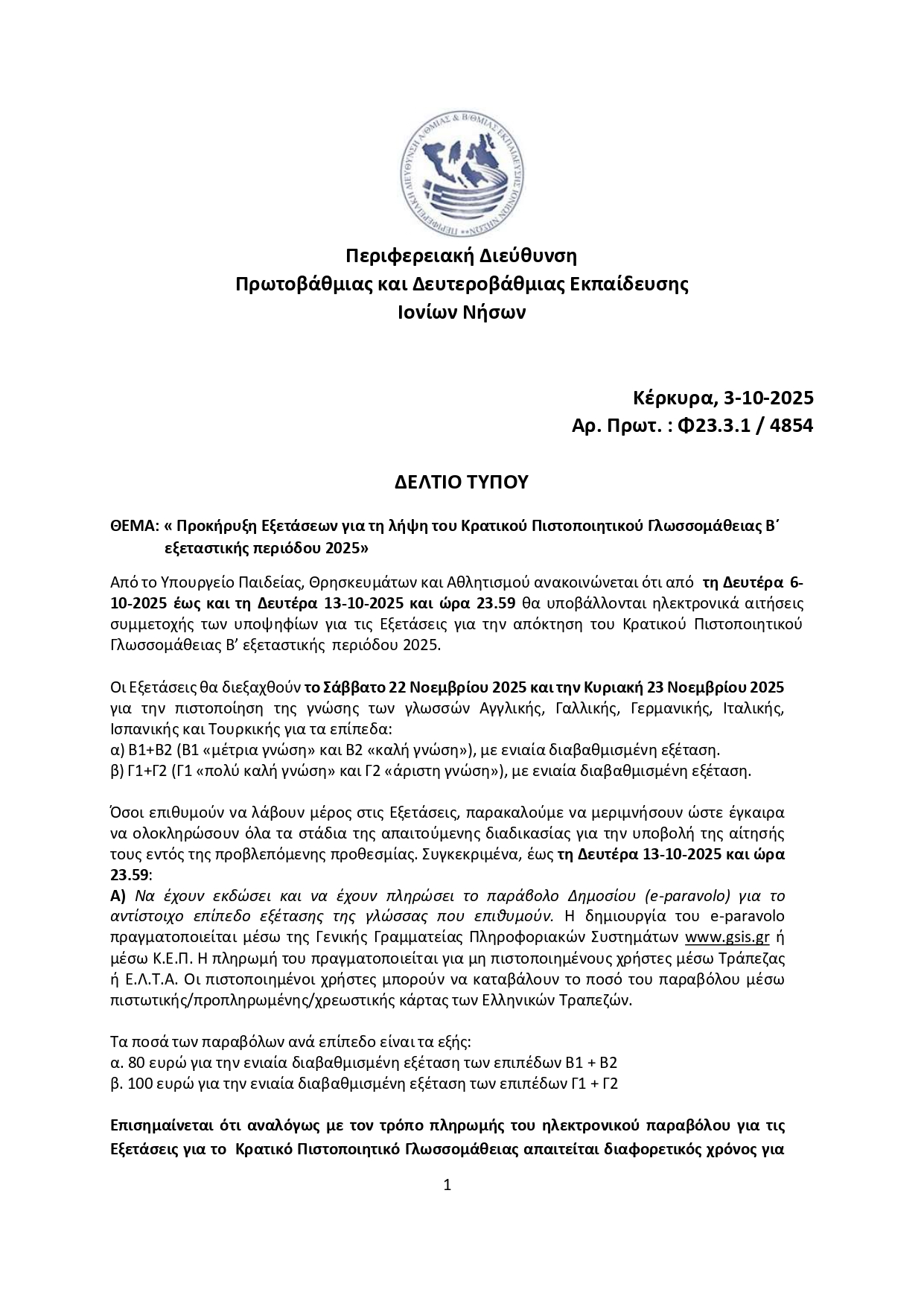 Προκήρυξη Εξετάσεων για τη λήψη του Κρατικού Πιστοποιητικού Γλωσσομάθειας Β΄ εξεταστικής περιόδου 2025