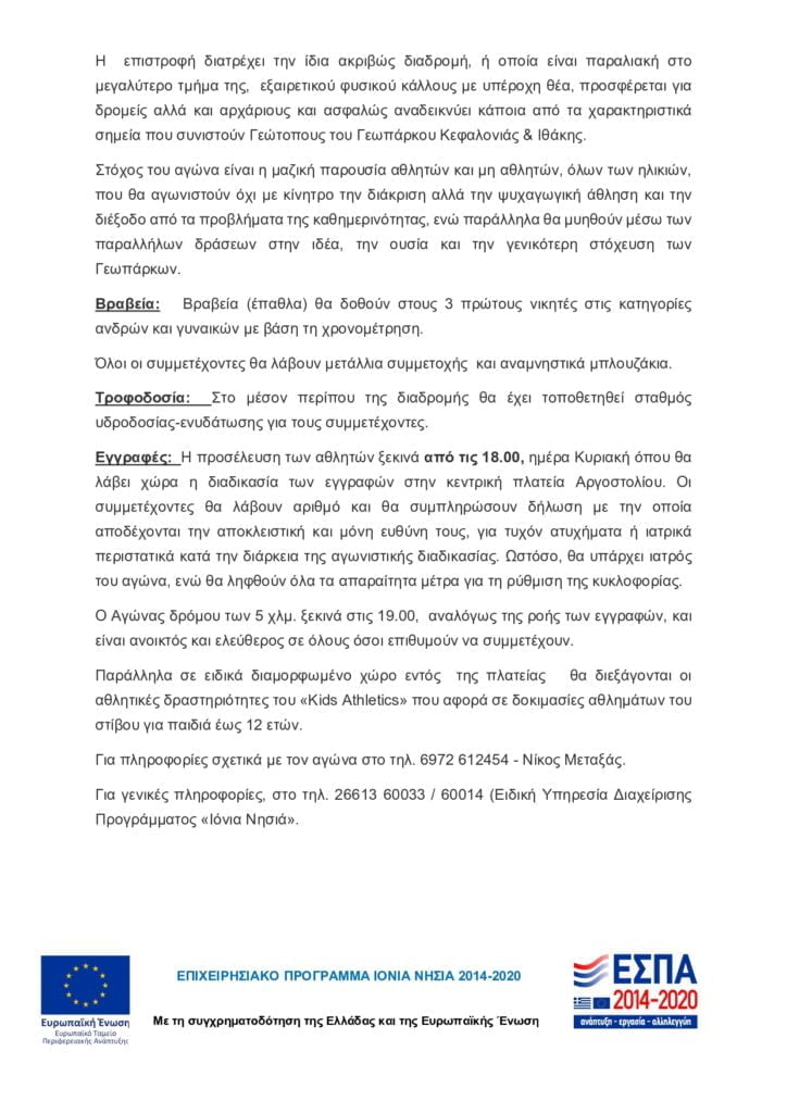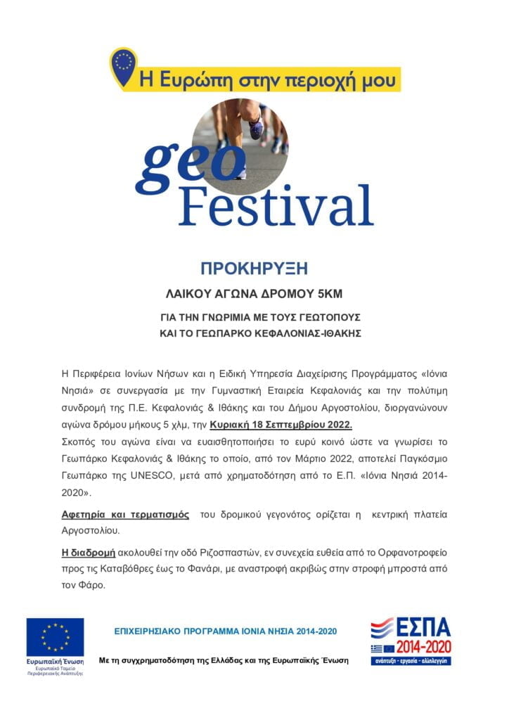 Προκήρυξη λαικού αγώνα δρόμου 5χλμ για τη γνωριμία με τους γεωτόπους και το Γεωπάρκο Κεφαλονιάς Ιθάκης την Κυριακή 18 Σεπτεμβρίου