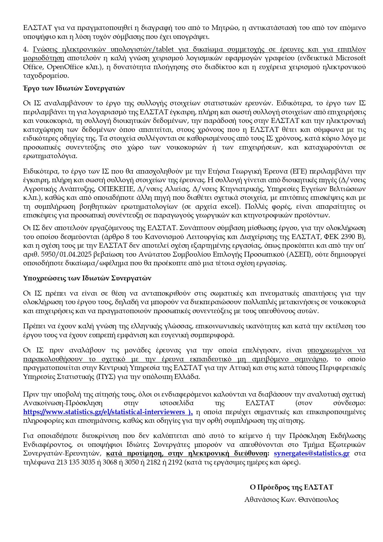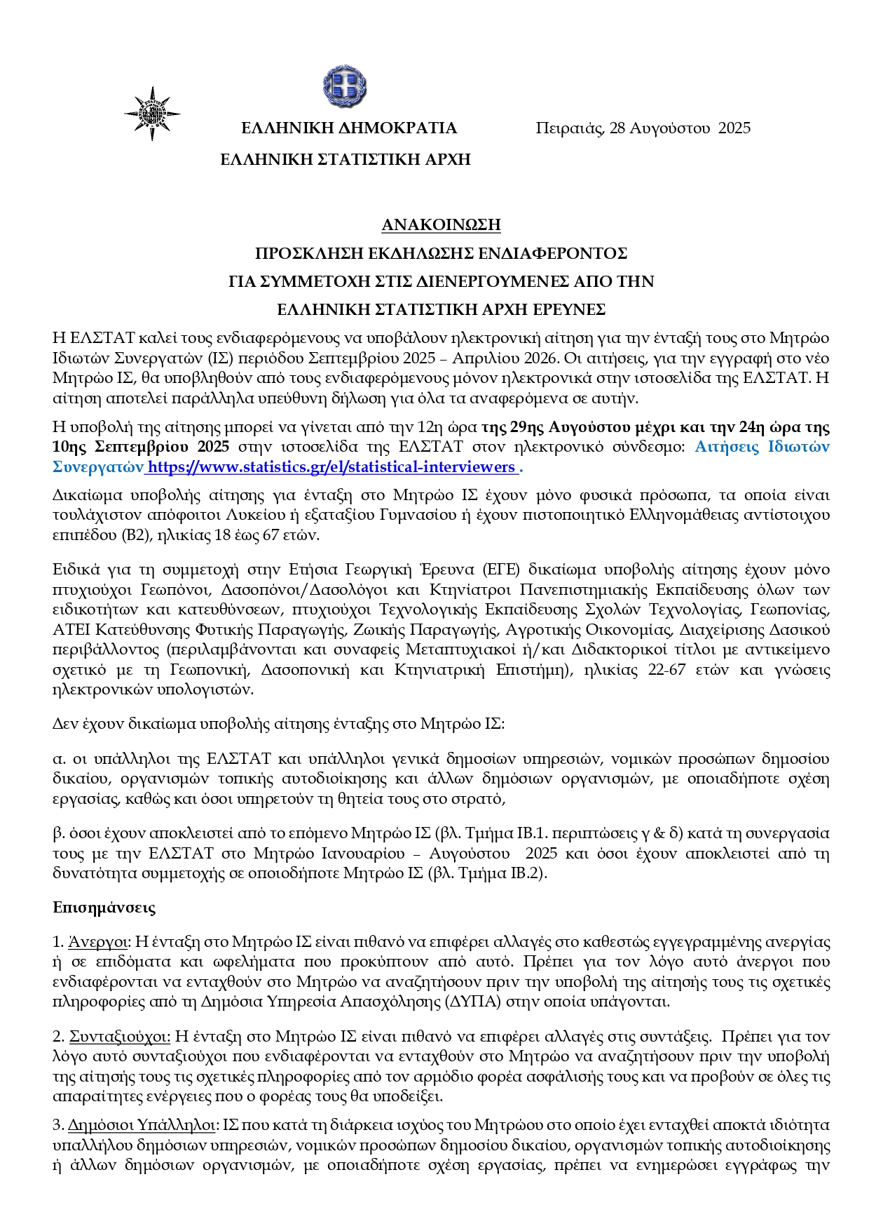 Πρόσκληση Εκδήλωσης Ενδιαφέροντος για συμμετοχή στις διενεργούμενες από την Ελληνική Στατιστική Αρχή έρευνες
