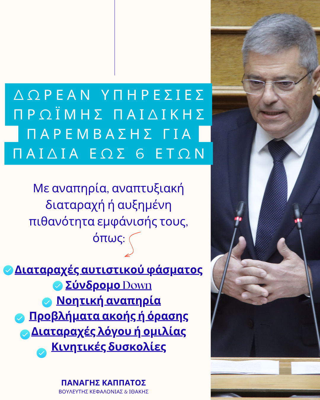 Ως Βουλευτής Κεφαλονιάς και Ιθάκης, ενημερώνω τους συμπολίτες μου ότι το Υπουργείο Κοινωνικής Συνοχής και Οικογένειας ξεκινά το Πιλοτικό Πρόγραμμα Πρώιμης Οικογενειοκεντρικής Παιδικής Παρέμβασης (Π.Π.Π.) για παιδιά έως 6 ετών με αναπηρία, αναπτυξιακή διαταραχή ή αυξημένη πιθανότητα εμφάνισής τους, όπως: