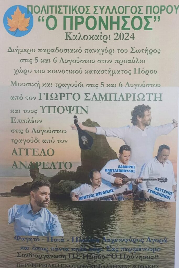 Οι εκδηλώσεις αποτελούν συνδιοργάνωση του Πολιτιστικού Συλλόγου του Πόρου “Ο Πρόνησος” και της Περιφερειακής Ενότητας Κεφαλονιάς και Ιθάκης!