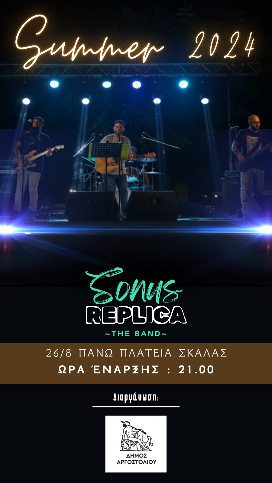 ΔΕΥΤΕΡΑ 26 Αυγούστου στην Πάνω Πλατεία της ΣΚΑΛΑΣ στις 9.00μμ.  ΡΟΚ Βραδιά με το συγκρότημα Sonus Replica Τhe Band.  Μια μπάντα με επιρροές από Southern Rock, Blues, Rock n’ Roll μέχρι και έντεχνο ελληνικό. Κιθάρα/Φωνητικά : Χρήστος Φωτεινόπουλος, Κιθάρα / Φωνητικά : Παναγιώτης Ρεματήσιος, Μπάσο : Περίανδρος Μεσσολωράς, Τύμπανα : Παναγής Φωτεινάτος
