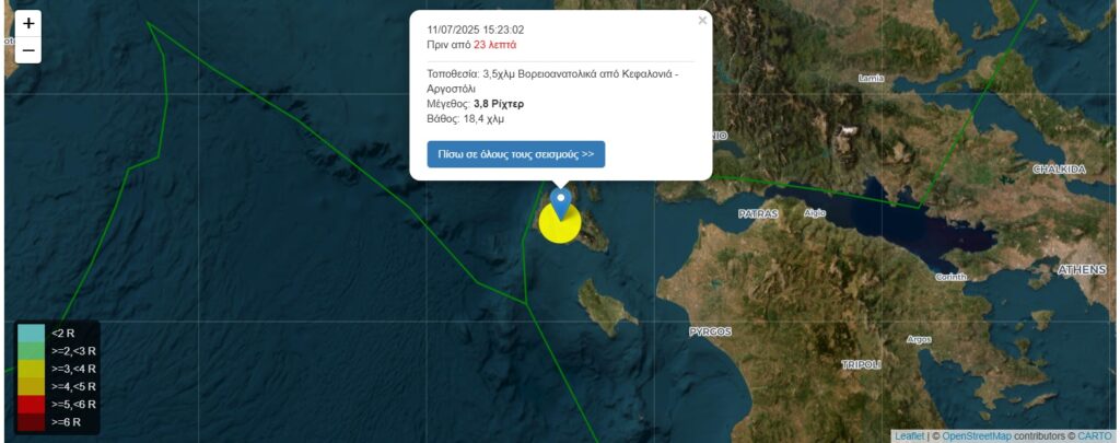 Σεισμική δόνηση 3,8 βαθμών της κλίμακας Ρίχτερ συνέβη στις 11/07/2025 15:23:02, 3,5χλμ Βορειοανατολικά από Κεφαλονιά – Αργοστόλι και σε εστιακό βάθος 18,4 χιλιομέτρων.