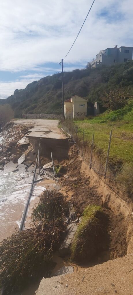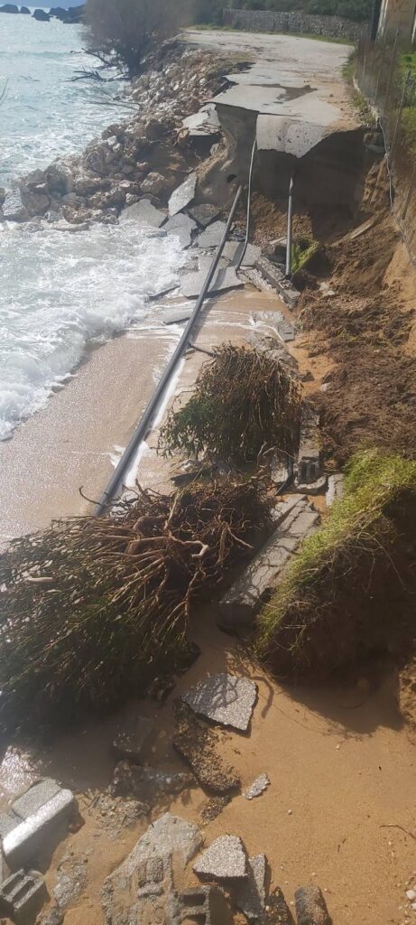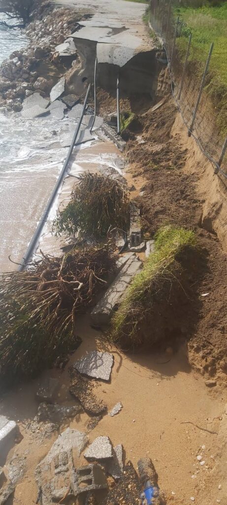 Η συνεχής ύπαρξη νερού στην επιφάνεια της γης χωρίς διαλείμματα αποστράγγιξης, δύναται να δημιουργήσει φαινόμενα καθιζήσεων και υποχώρησης του εδάφους. Στο συγκεκριμένο σημείο οι έντονες βροχοπτώσεις συνδυάστηκαν και με ισχυρούς νοτιάδες των οποίων οι μεγάλοι κυματισμοί σφυροκόπησαν τα παράλια.