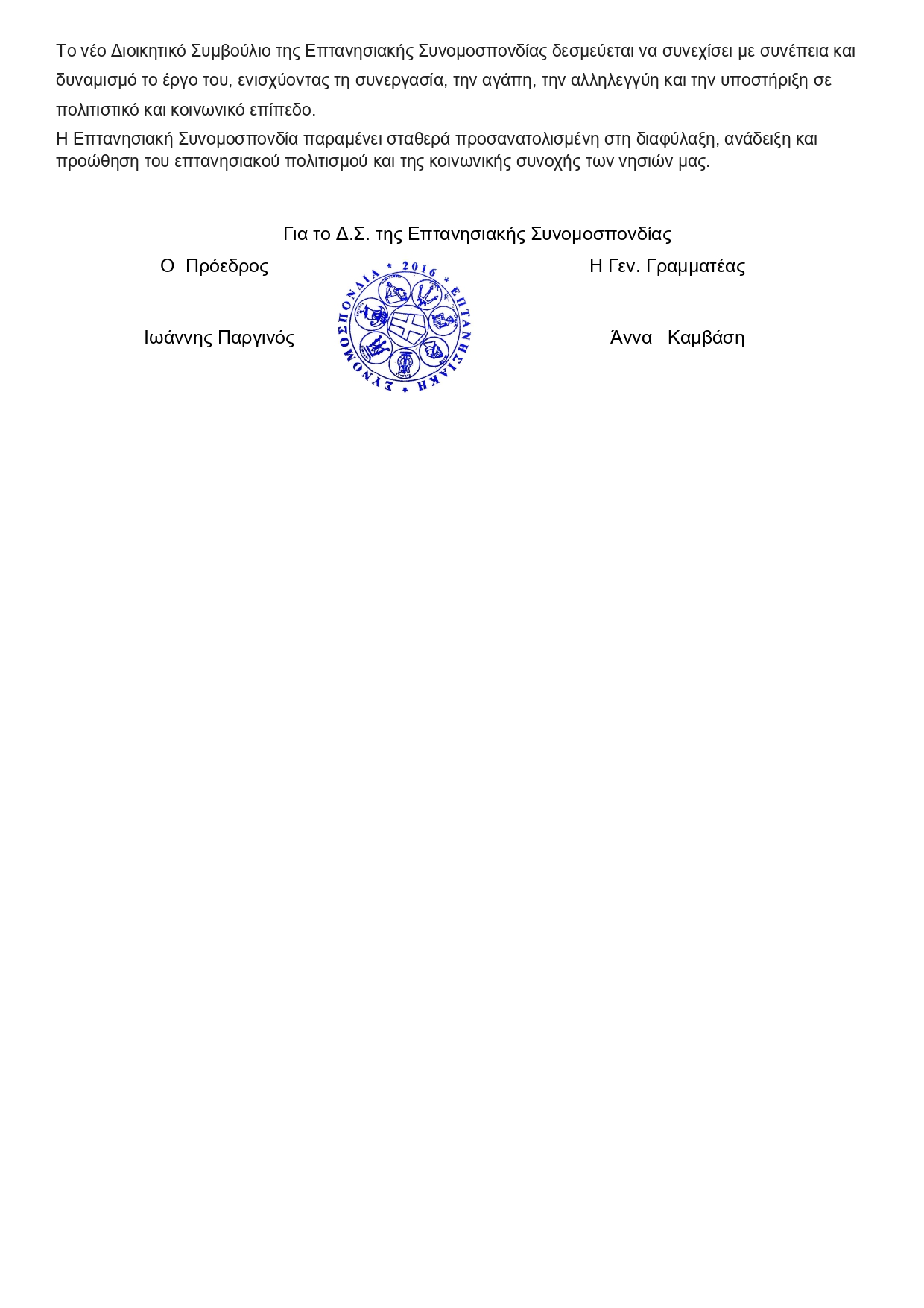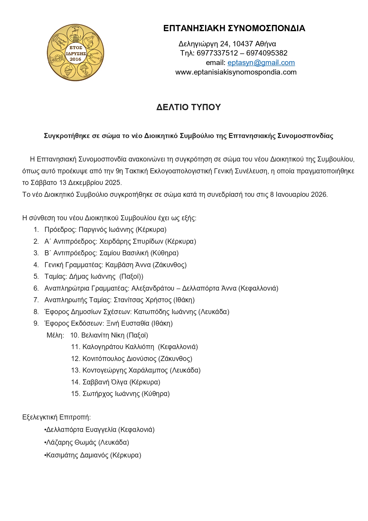 Συγκροτήθηκε σε σώμα το νέο Διοικητικό Συμβούλιο της Επτανησιακής Συνομοσπονδίας
