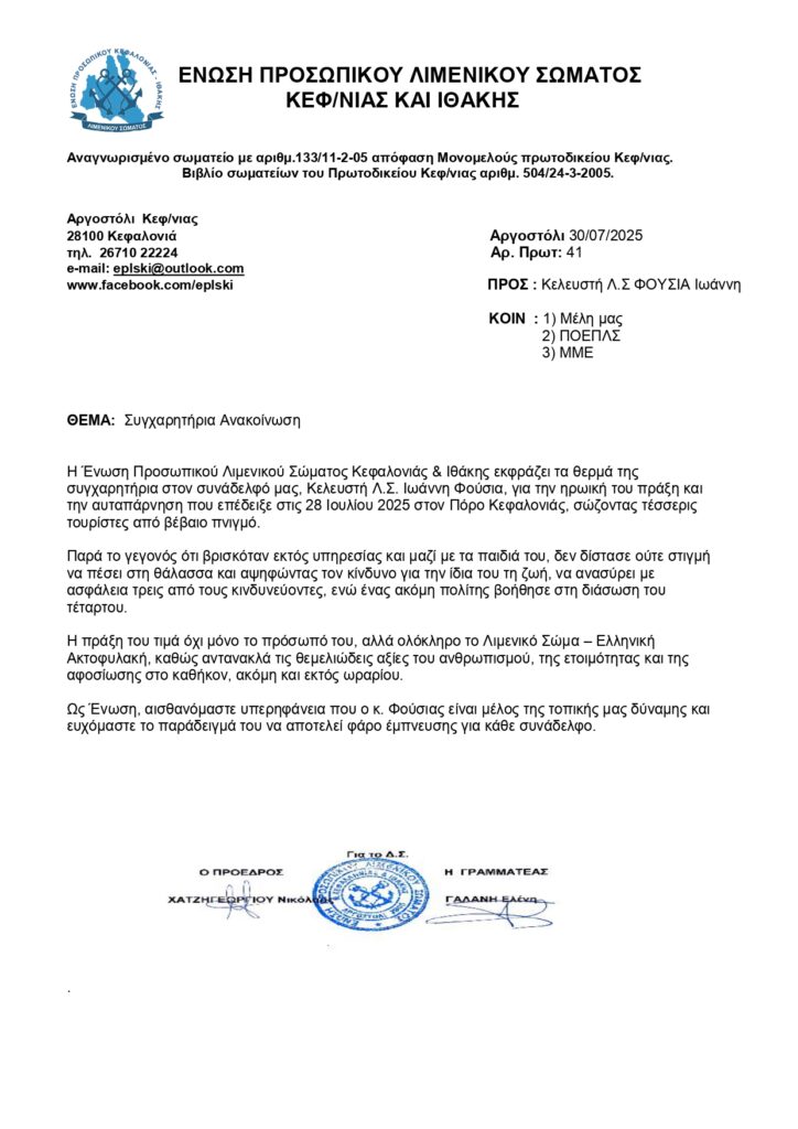 Συγχαρητήρια επιστολή στον Κελευστή ΚΣ Ιωάννη Φούσια-Έσωσε 4 άτομα από πνιγμό στον Πόρο