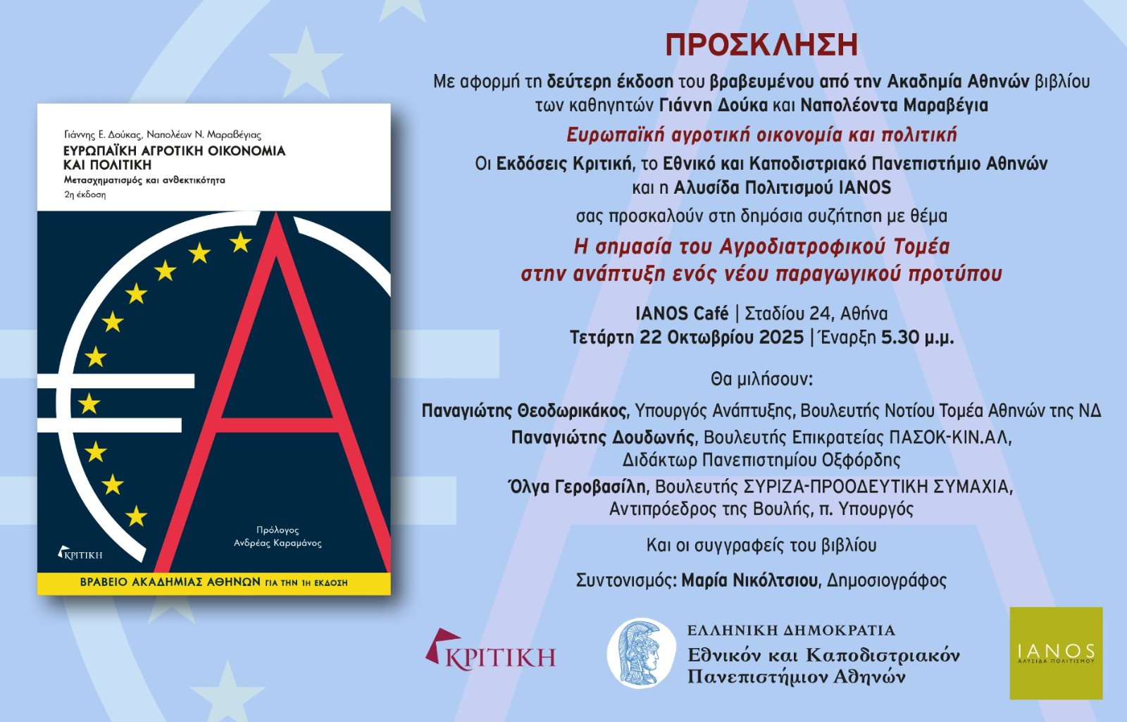 Η εκδήλωση οργανώνεται από την Αλυσίδα Πολιτισμού ΙΑΝΟΣ, το Εθνικό και Καποδιστριακό Πανεπιστήμιο Αθηνών και τις Εκδόσεις Κριτική, με αφορμή τη δεύτερη έκδοση του βιβλίου που συνυπογράφουμε με τον Γιάννη Δούκα,