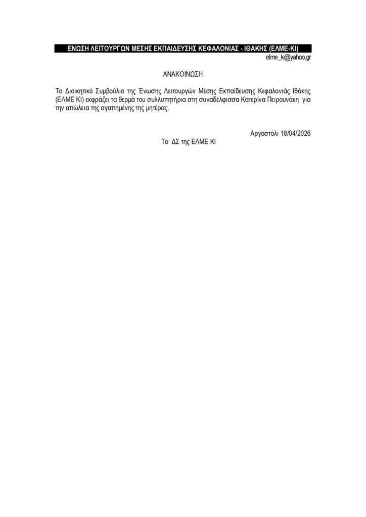 Συλλυπητήριο μήνυμα στη συναδέλφισσα Κατερίνα Πειρουνάκη για την απώλεια της μητέρας της