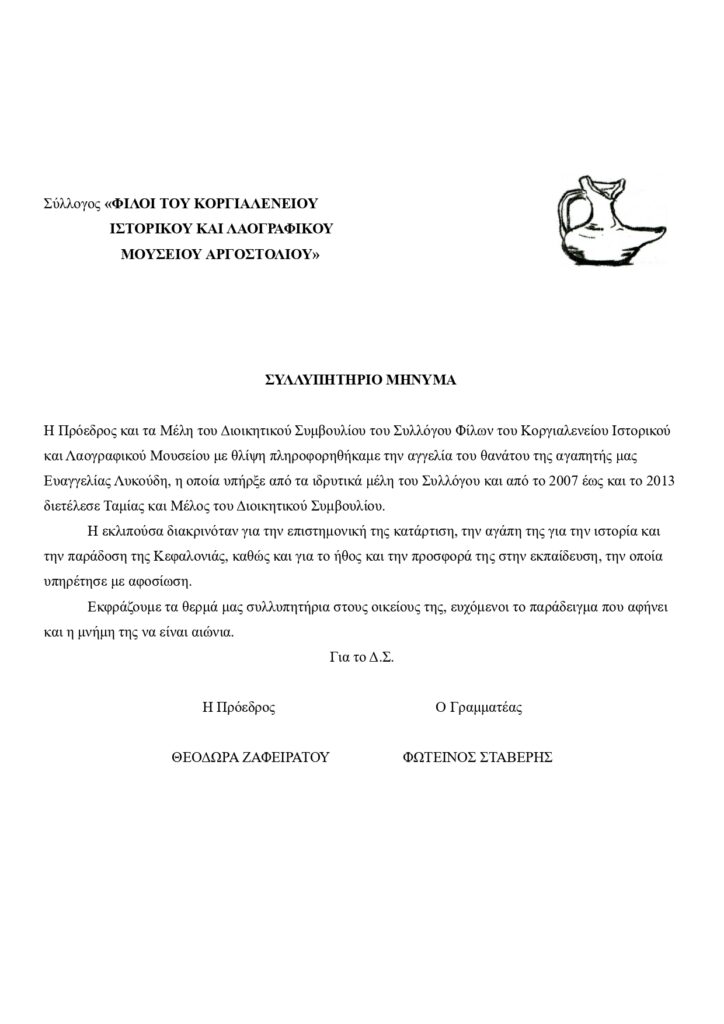 Συλλυπητήριο μήνυμα του Συλλόγου “Φίλοι του Ιστορικού και Λαογραφικού Κοργιαλένειου Μουσείου” για τον θάνατο της Ευαγγελίας Λυκούδη