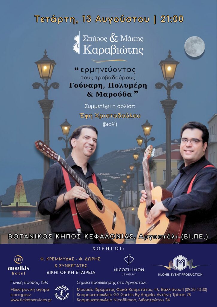 Οι τροβαδούροι της Κεφαλονιάς Σπύρος & Μάκης Καραβιώτης σας προσκαλούν στον Βοτανικό Κήπο Κεφαλονιάς (Αργοστόλι ΒΙ.ΠΕ.) την Τετάρτη 13 Αυγούστου 2025 & ώρα 21:00 σε ένα ξεχωριστό αφιέρωμα με τίτλο: