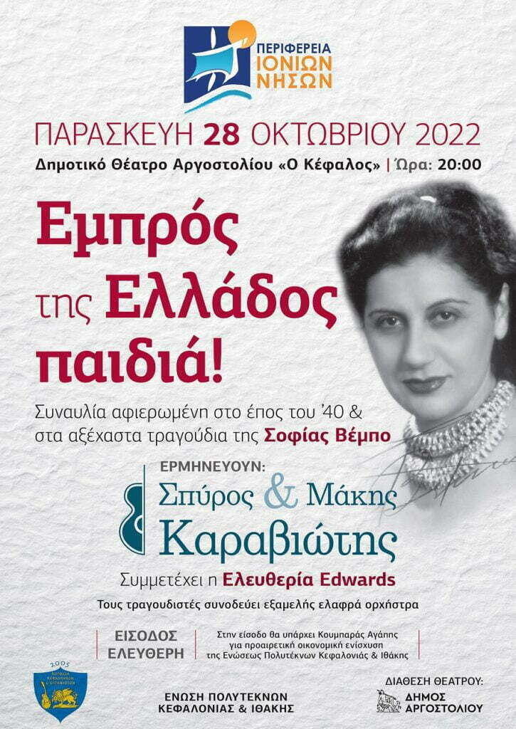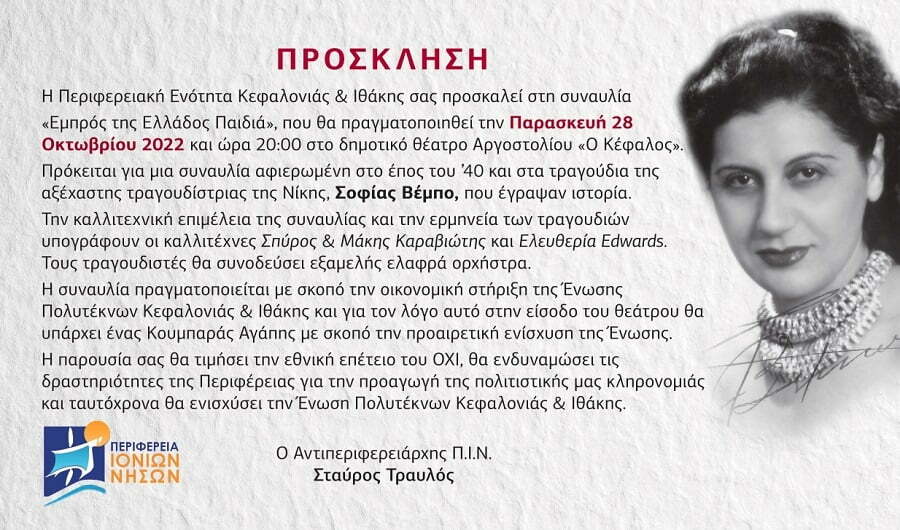 Η Περιφερειακή Ενότητα Κεφαλονιάς & Ιθάκης σας προσκαλεί στη συναυλία «Εμπρός της Ελλάδος Παιδιά», που θα πραγματοποιηθεί την Παρασκευή 28 Οκτωβρίου 2022 και ώρα 20:00 στο δημοτικό θέατρο Αργοστολίου «Ο Κέφαλος».