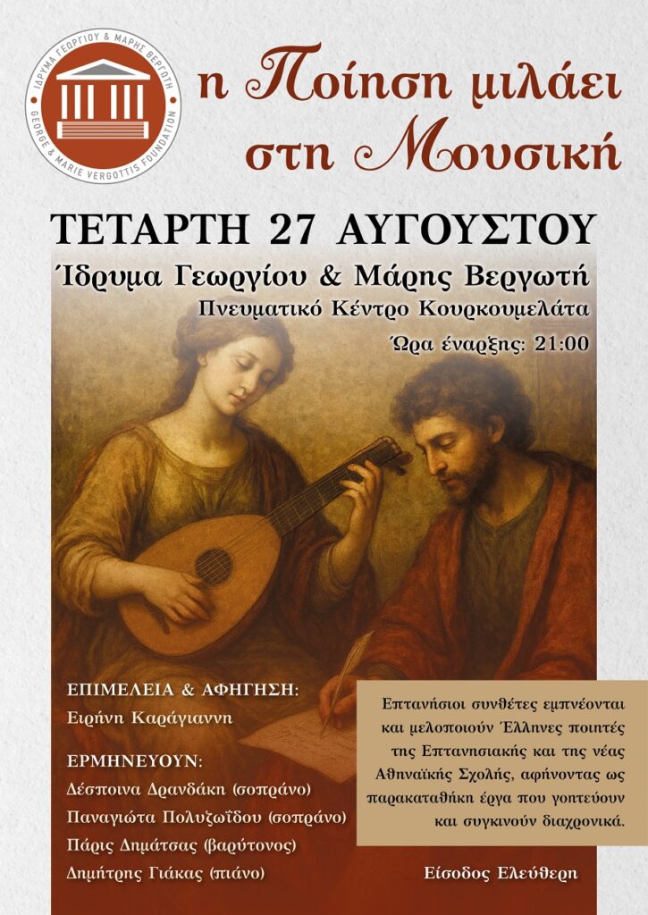 Το Ίδρυμα Γεωργίου και Μάρης Βεργωτή παρουσιάζει τη συναυλία «Η Ποίηση μιλάει στη Μουσική», η οποία θα πραγματοποιηθεί στο Πνευματικό Κέντρο του Ιδρύματος στα Κουρκουμελάτα, την Τετάρτη 27 Αυγούστου, στις 21:00.