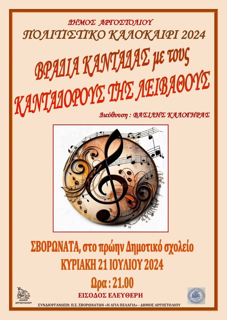 Η εκδήλωση που πραγματοποιείται σε συνδιοργάνωση με το Δήμο Αργοστολίου, θα γίνει την Κυριακή 21 Ιουλίου 2024 στις 9 το βράδυ στον αύλειο χώρο του Πολιτιστικού μας κέντρου, πρώην Δημοτικό Σχολείο Σβορωνάτων.