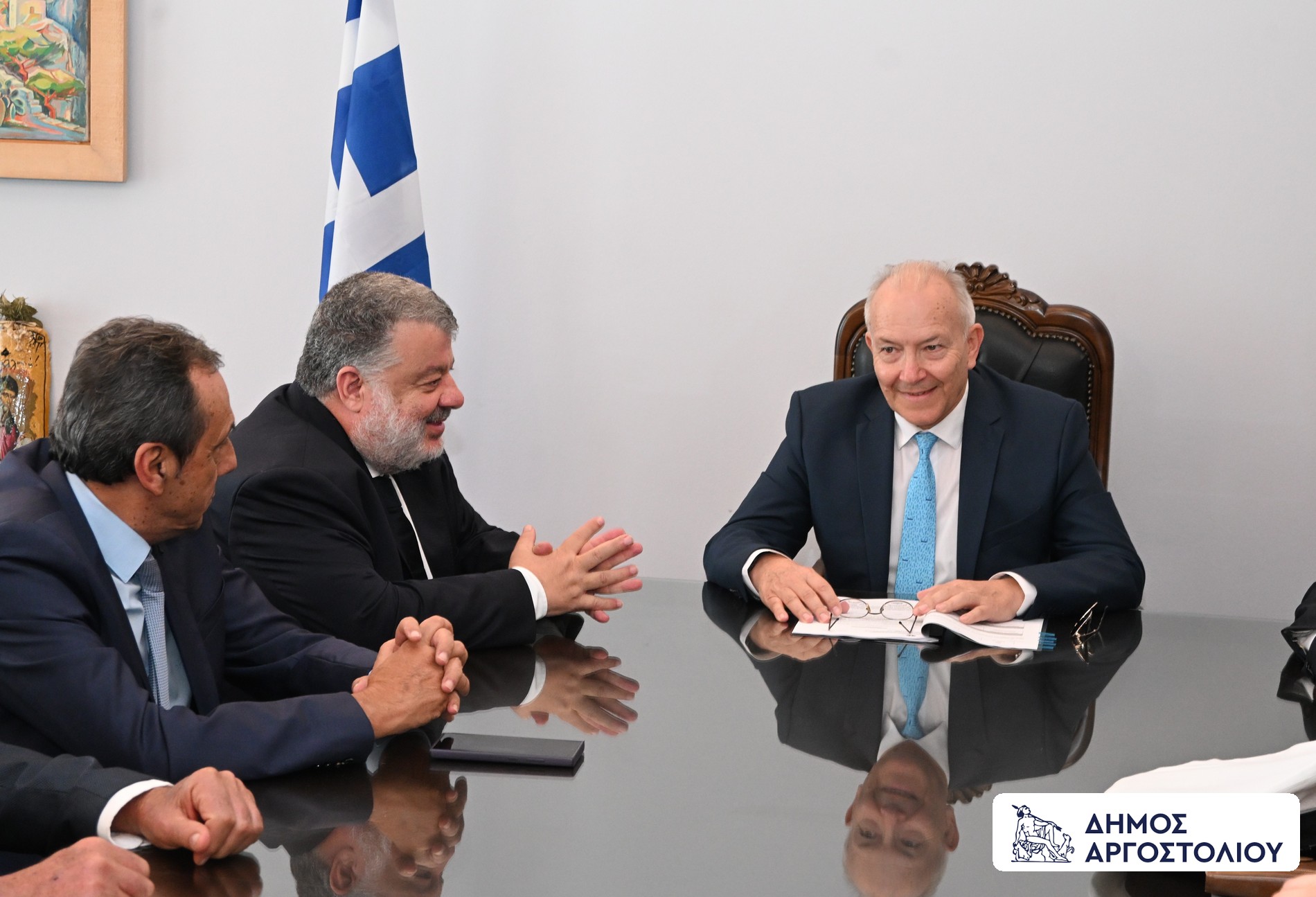Την Δευτέρα 20 Οκτωβρίου 2025, ο Δήμαρχος Αργοστολίου και Πρόεδρος του Λιμενικού Ταμείου Κεφαλονιάς και Ιθάκης, κ. Θεόφιλος Μιχαλάτος, μαζί με τους Αντιδημάρχους κ.κ. Σπύρο Σαμούρη και Διονύση Κωνσταντάτο, υποδέχθηκαν στο Δημαρχείο, τον Υφυπουργό Ναυτιλίας και Νησιωτικής Πολιτικής, κ. Στέφανο Γκίκα.