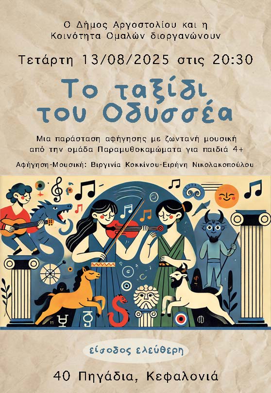 Συναντάμε τους Κύκλωπες, την Κίρκη, την Καλυψώ, τους Λωτοφάγους και τις μαγευτικές Σειρήνες σε μια παράσταση που συνδυάζει αφήγηση, μουσική και διάδραση από την Ομάδα Παραμυθοκαμώματα.