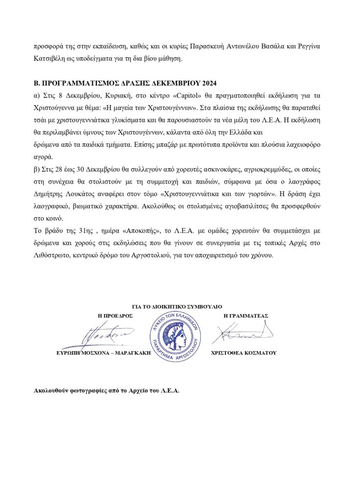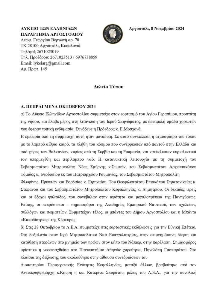 Τα πεπραγμένα του Λυκείου Ελληνίδων για το μήνα Οκτώβριο