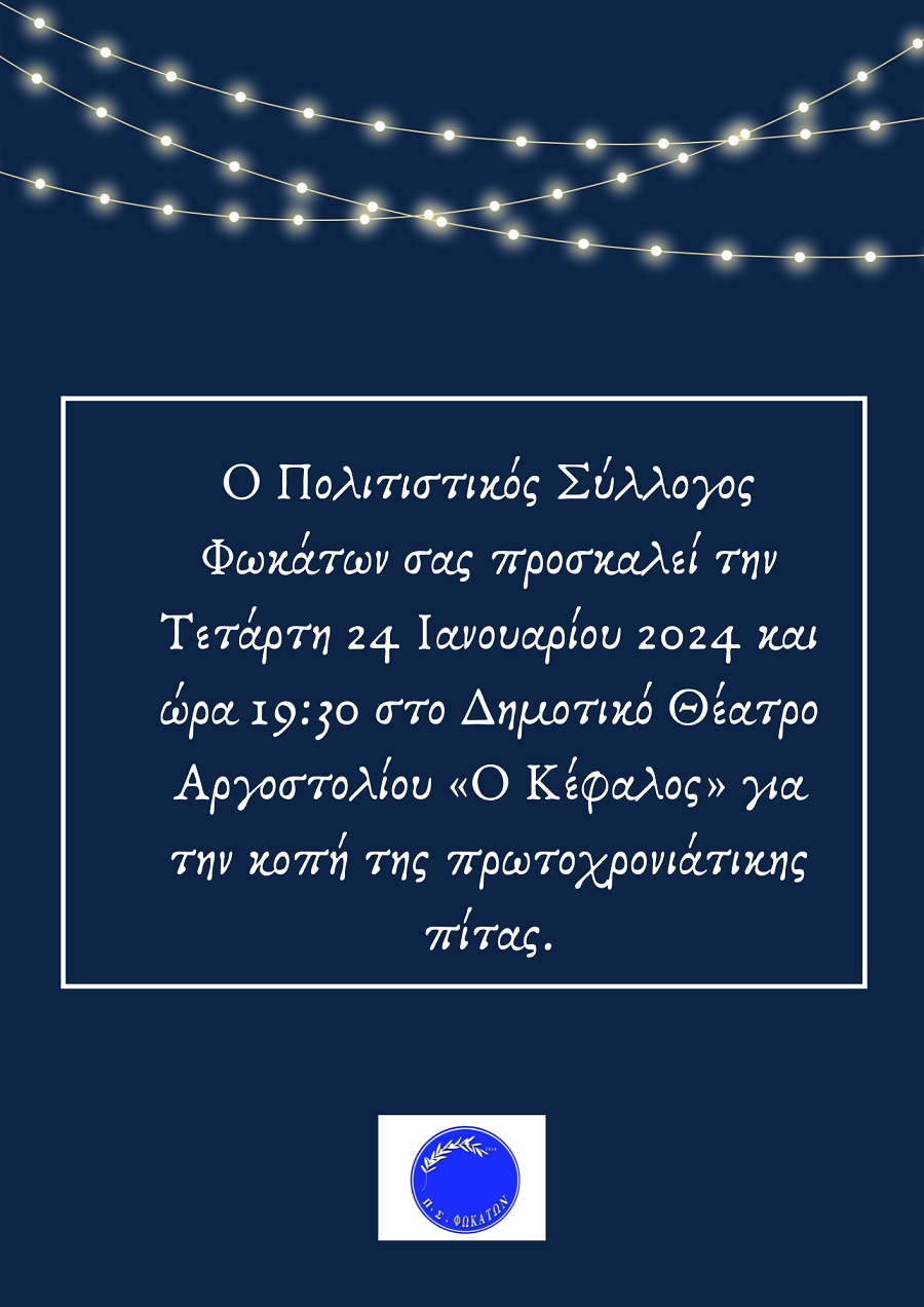 Σας προσκαλούμε να μας τιμήσετε με την παρουσία σας στην κοπή της πρωτοχρονιάτικης βασιλόπιτας του Π.Σ. ΦΩΚΑΤΩΝ την Τετάρτη 24 Ιανουαρίου 2024 και ώρα 7.30 το απόγευμα στο Δημοτικό θέατρο Αργοστολίου «ο Κέφαλος».