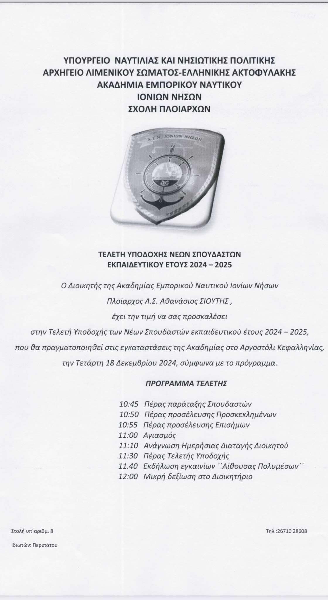 Σας γνωρίζουμε ότι την Τετάρτη, 18 Δεκεμβρίου 2024  θα διεξαχθεί στις εγκαταστάσεις της  Ακαδημίας Εμπορικού Ναυτικού Ιονίων Νήσων εκδήλωση  Τελετής Υποδοχής Νέων Σπουδαστών Εκπαιδευτικού Έτους 2024 – 2025 σύμφωνα με το παρακάτω πρόγραμμα: