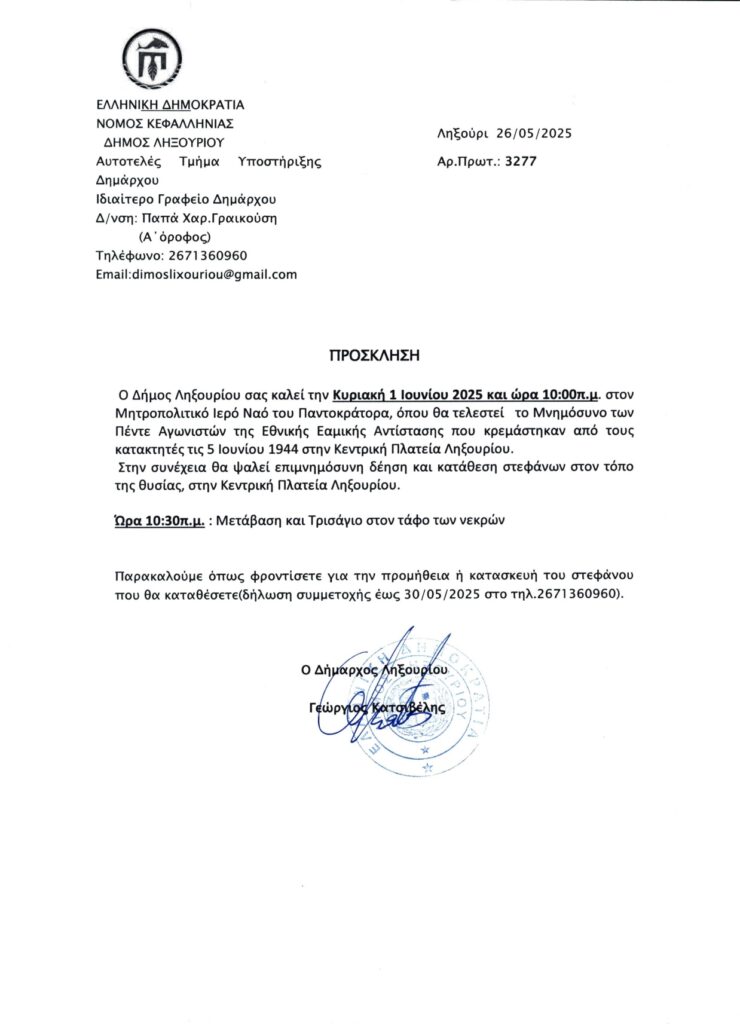 Την Κυριακή 1η Ιουνίου μνημόσυνο των 5 Αγωνιστών της Εθνικής Εαμικής Αντίστασης στο Ληξούρι