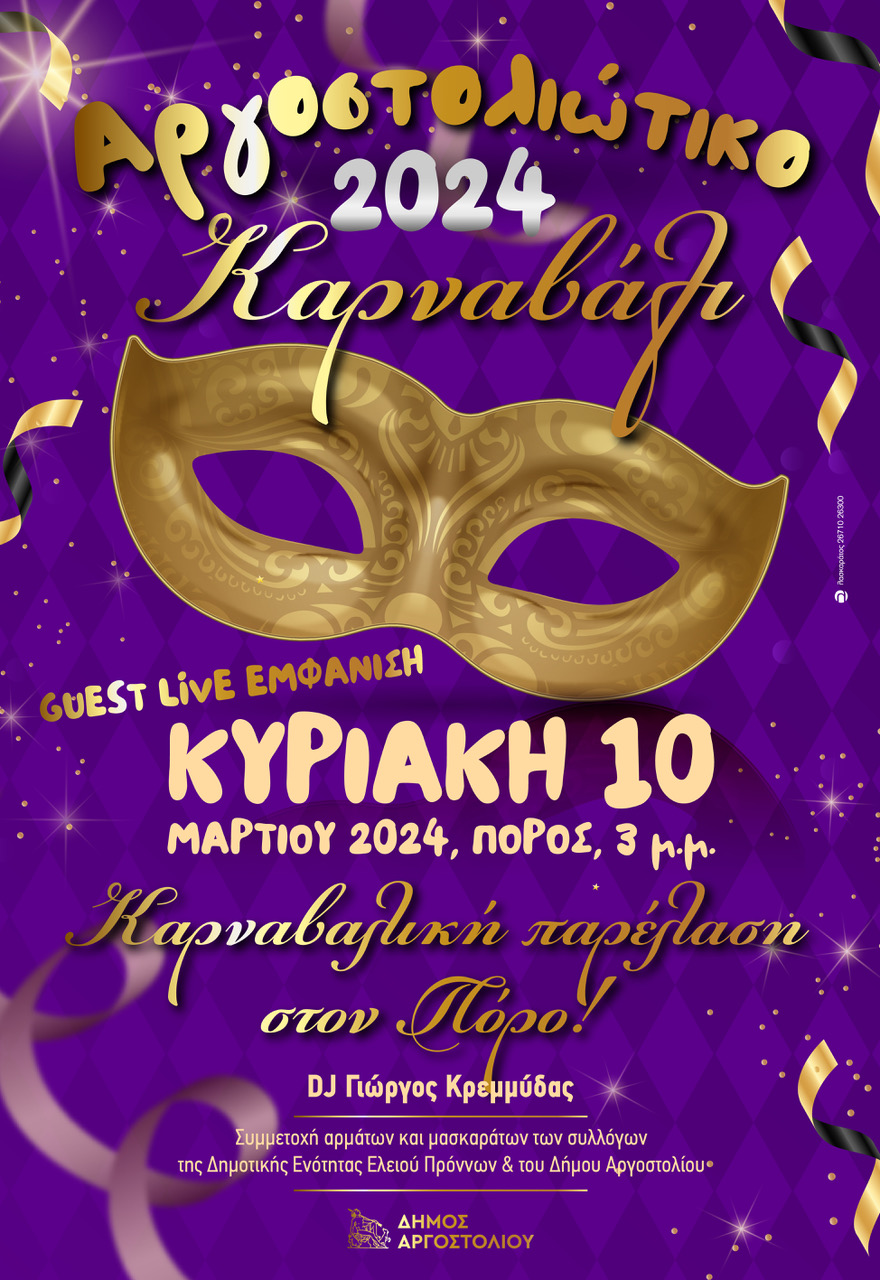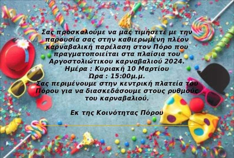 Σας προσκαλούμε όλους,  στην κεντρική πλατεία του πόρου την Κυριακή 10 Μαρτίου 2024, για να διασκεδάσουμε,  να γιορτάσουμε   και να γλεντήσουμε παρέα στη μεγάλη αυτή γιορτή.  Η παρέλαση θα ξεκινήσει στις στις 3 το   μεσημέρι με  άρματα,  καρναβαλιστές, μασκότ,  ξυλοπόδαρους και θα ολοκληρωθεί με καλλιτεχνικό πρόγραμμα, για  να βιώσουμε όλοι μαζί, τη χαρά και το γέλιο που φέρνει μαζί του το καρναβάλι.