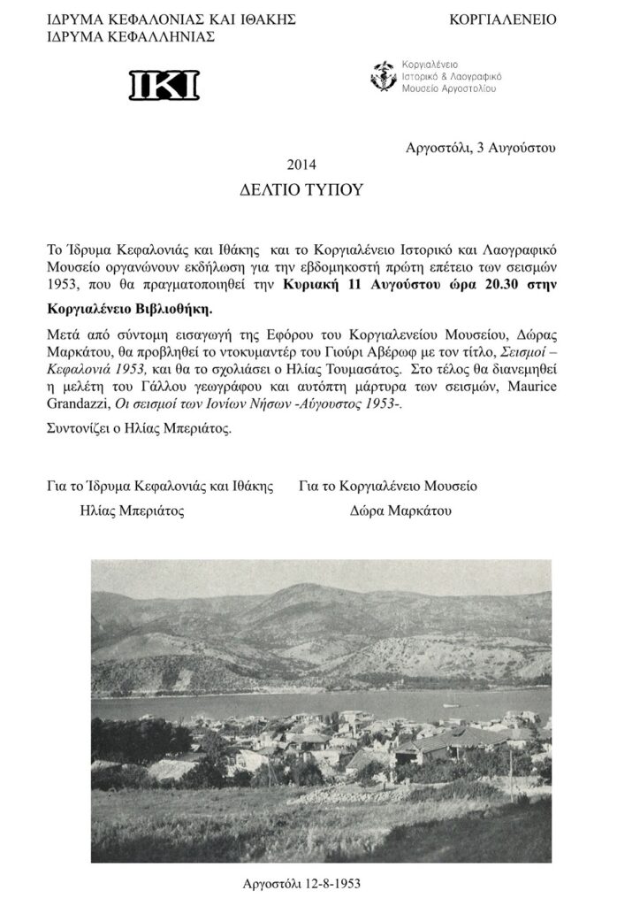 Την Κυριακή 11 Αυγούστου εκδήλωση για την 71η επέτειο των σεισμών 1953 στην Κοργιαλένειο Βιβλιοθήκη