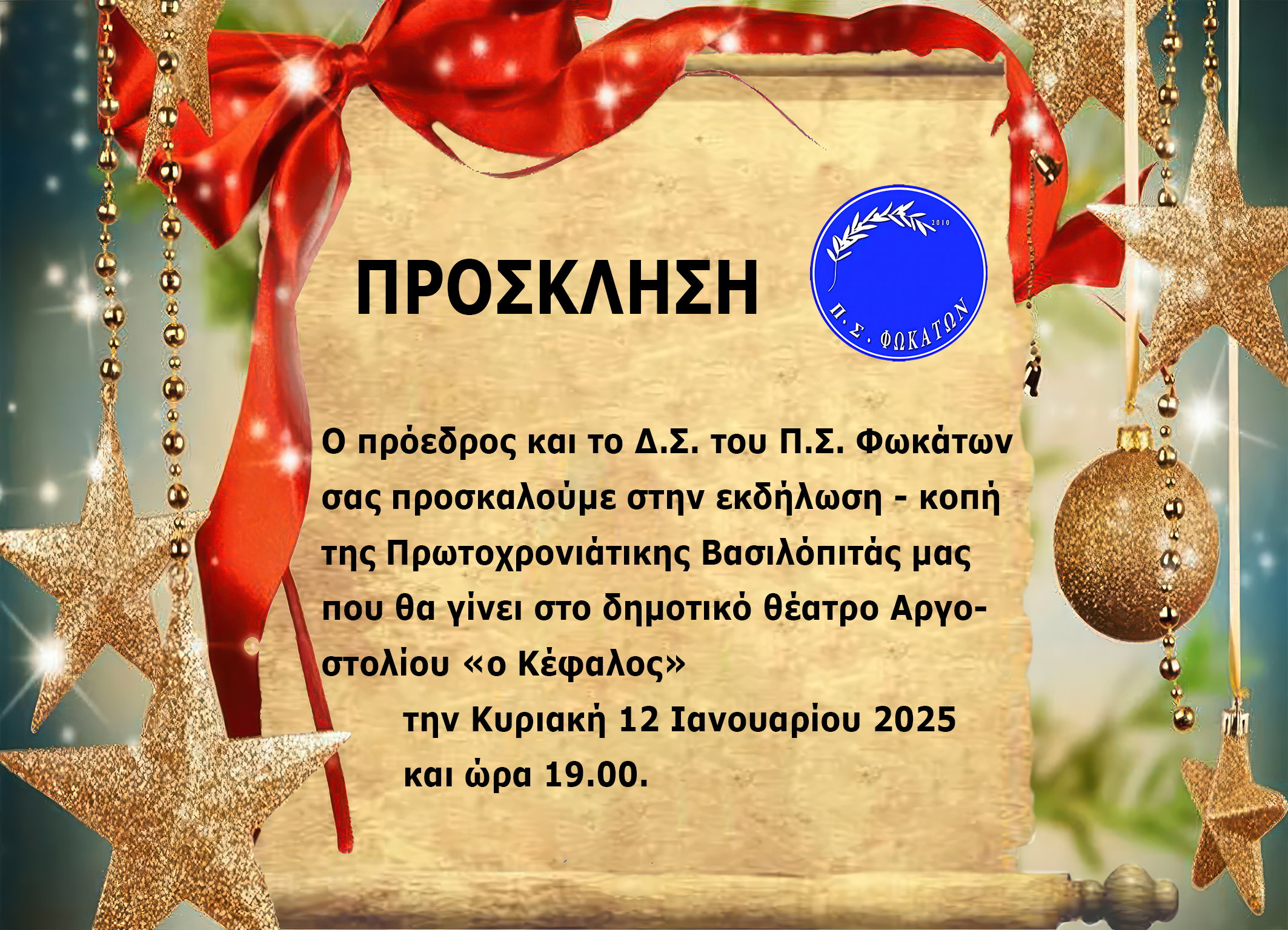 Σας προσκαλούμε όλους να μας τιμήσετε με την παρουσία σας στην εκδήλωση-κοπή της Βασιλόπιτας του συλλόγου μας Π.Σ ΦΩΚΑΤΩΝ που θα πραγματοποιηθεί στο Δημοτικό θέατρο Αργοστολίου¨Ο ΚΕΦΑΛΟΣ την Κυριακή 12 Ιανουαρίου 2025 και ώρα 19.00.
