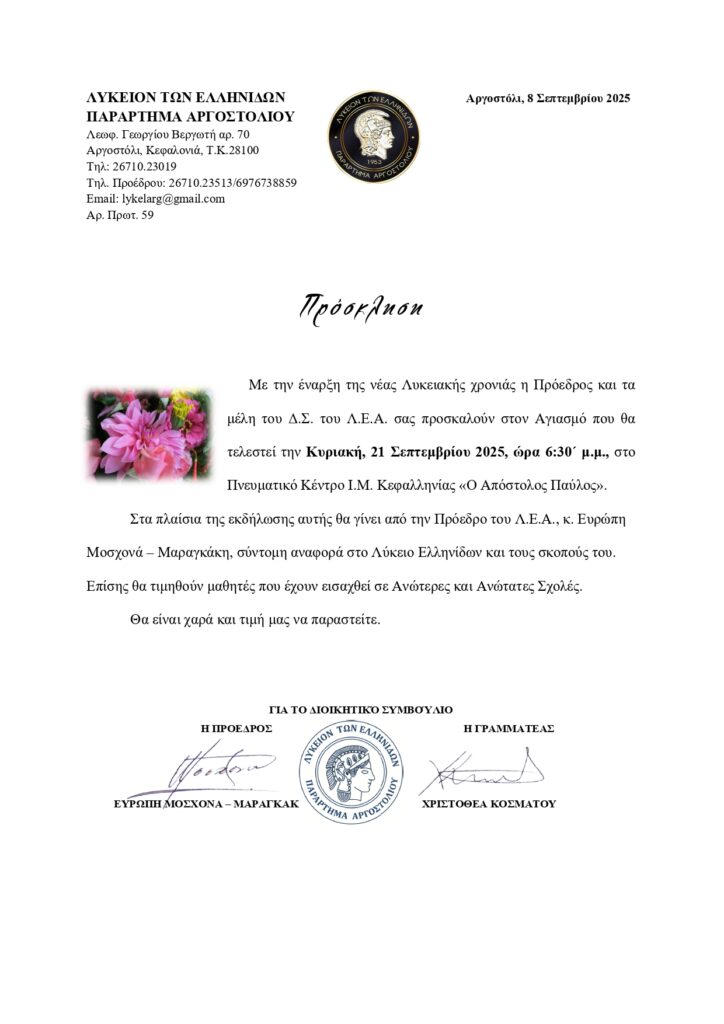 Την Κυριακή 21 Σεπτεμβρίου θα τελεστεί Αγιασμός για την έναρξη της νέας χρονιάς του Λυκείου Ελληνίδων στο Πνευματικό Κέντρο “Απόστολος Παύλος”