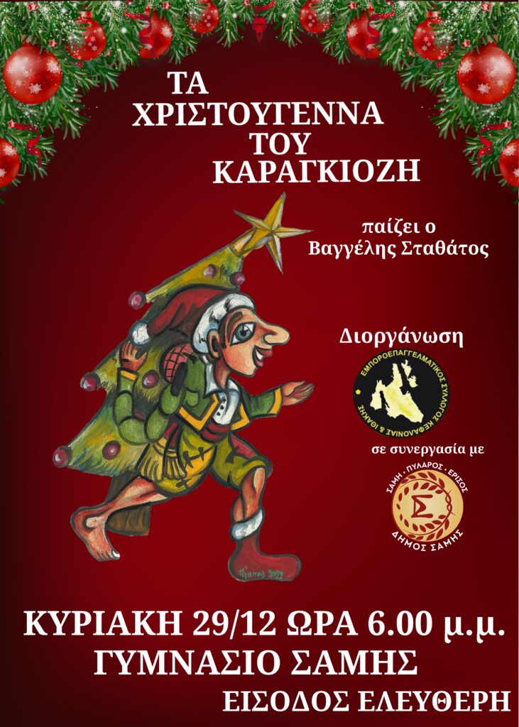 Η παράσταση “Τα Χριστούγεννα του Καραγκιόζη” την Κυριακή 29 Δεκεμβρίου 2024 στο Γυμνάσιο Σάμης. Είσοδος Ελεύθερη. Διοργάνωση Εμποροεπαγγελματικός Σύλλογος Κεφαλονιάς και Ιθάκης σε συνεργασία με το Δήμο Σάμης.