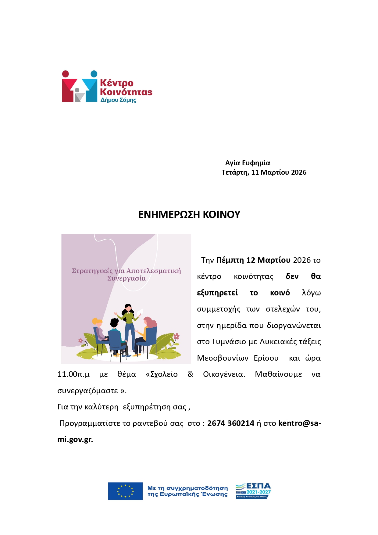 Την Πέμπτη 12 Μαρτίου το Κέντρο Κοινότητας Σάμης δεν θα εξυπηρετεί το κοινό